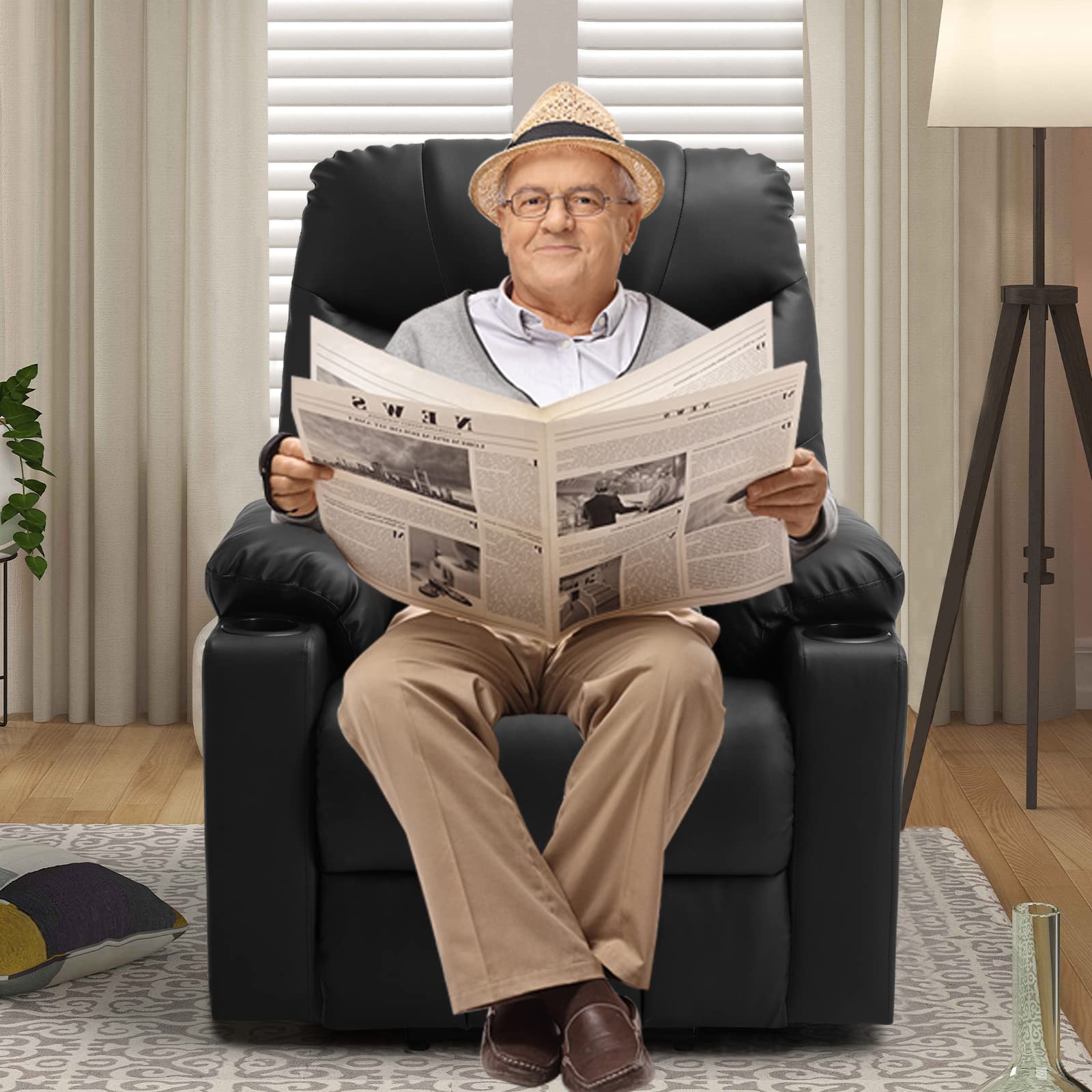 - Comfortable Soft Upholstery The power lift recliner is made of good quality material. Air-breathing soft PU leather finish, thick sponge padding, high back and wide armrest provide a very comfortable feel from sitting to 150° flat of relaxation, it's a great choice for home theater .