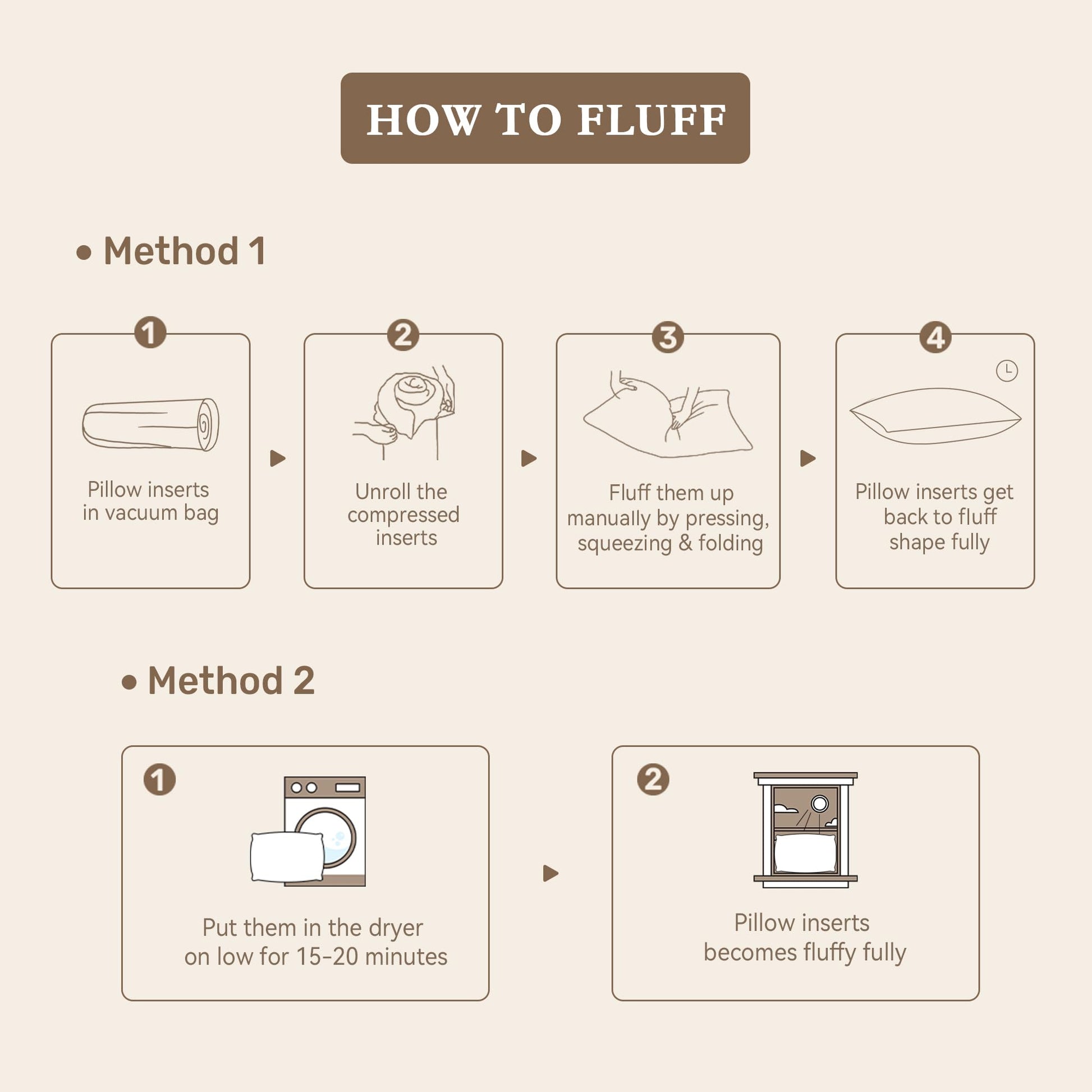 - Size Guide & Use Tip - We generally recommend using inserts that are 2" larger all around than your pillow cover size for a full, high-end look; Using a dryer helps pillows fluff up quickly, place your pillows along with dryer balls in your dryer on low for 15 mins