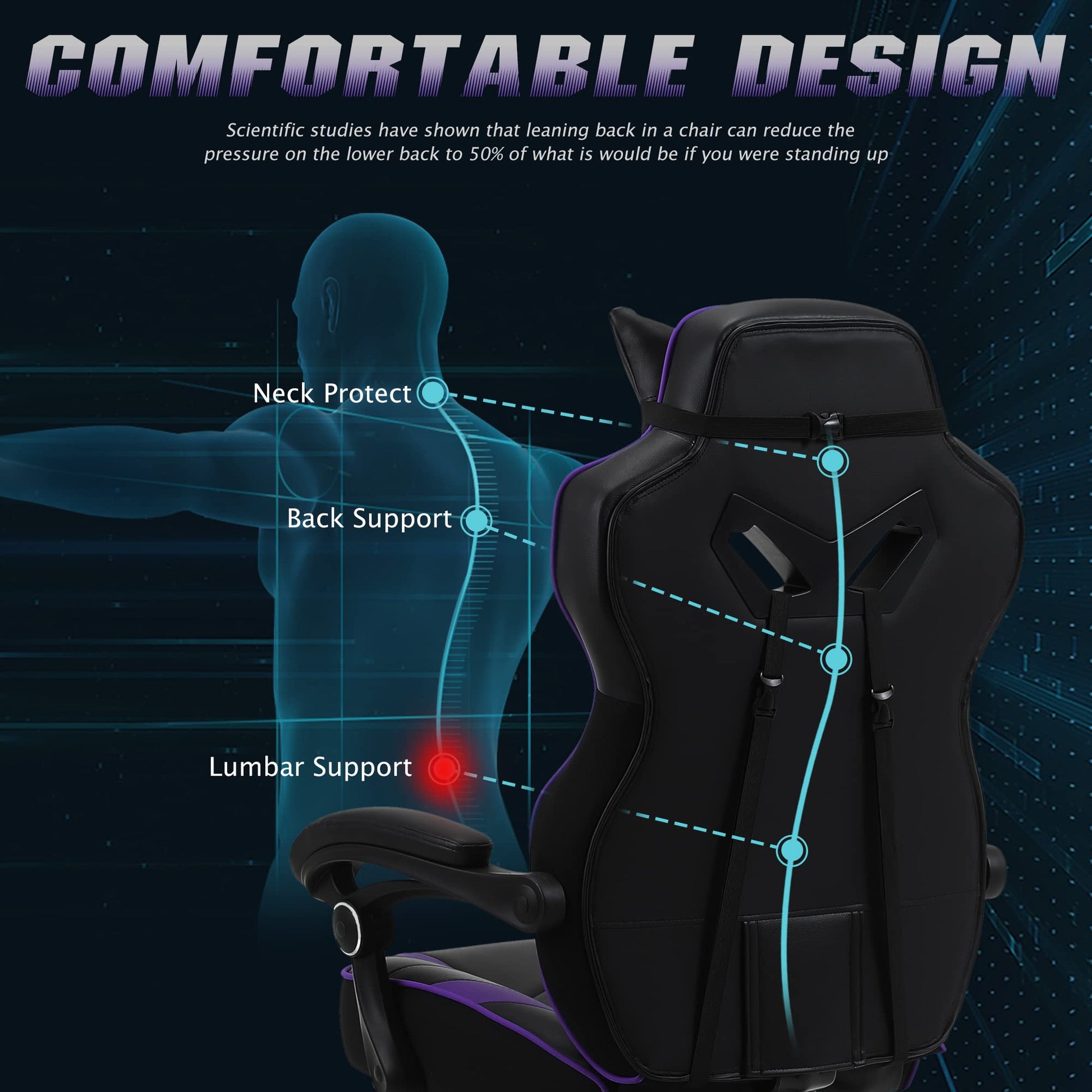 - Ergonomic Design of Massage Gaming Chair: The strong frame of ergonomic design chair and high backrest with massage lumbar cushion supply the maximum comfort when you spending long hours of gaming. The lumbar support and headrest pillow to protect your spine and neck.