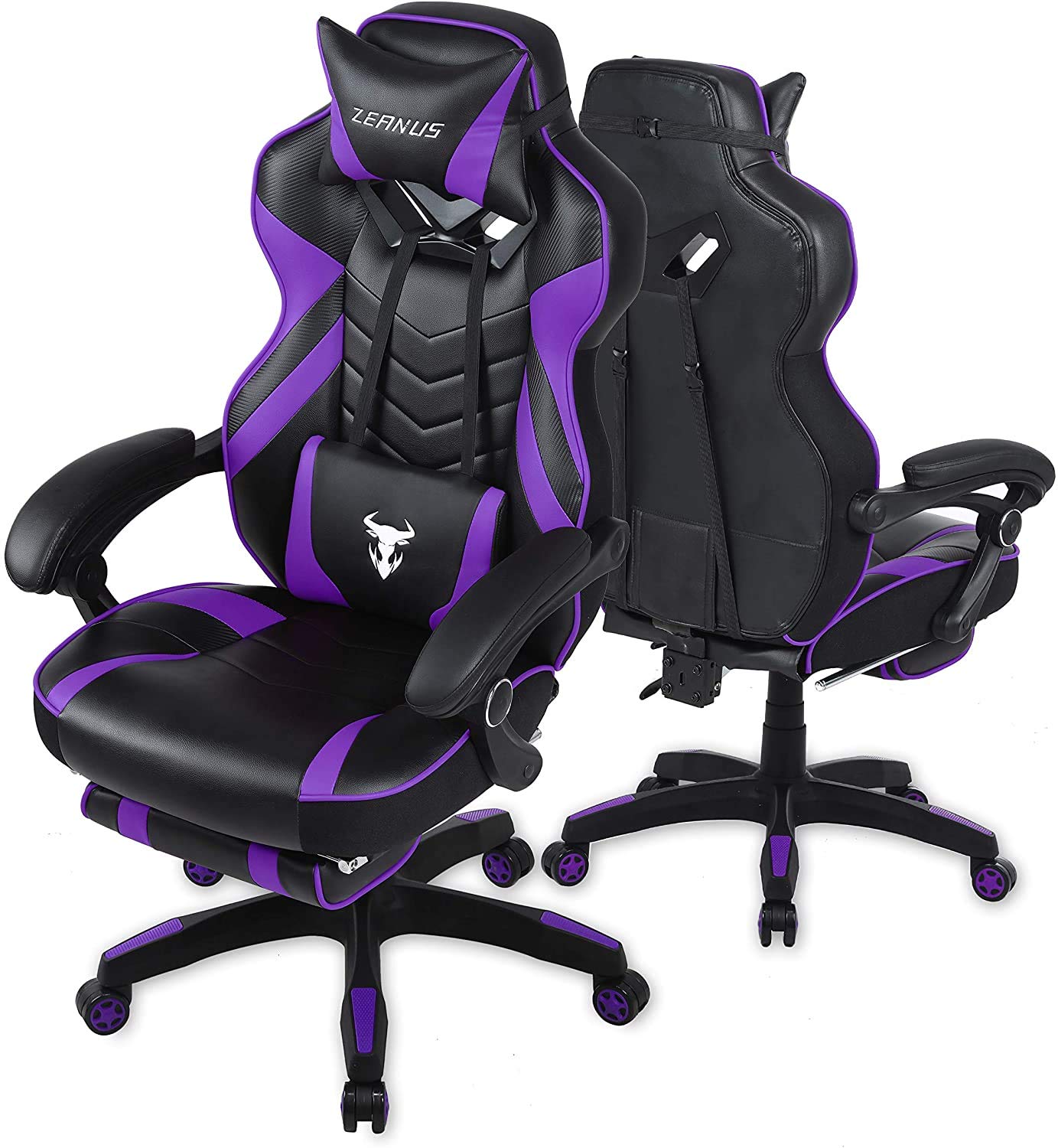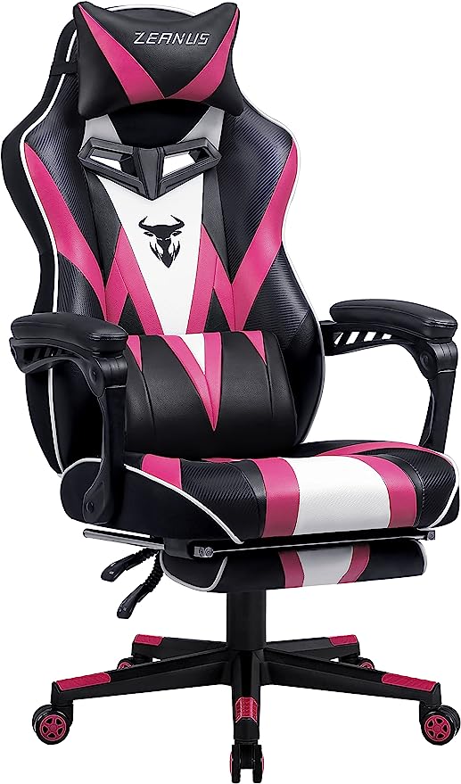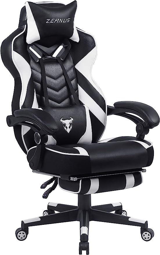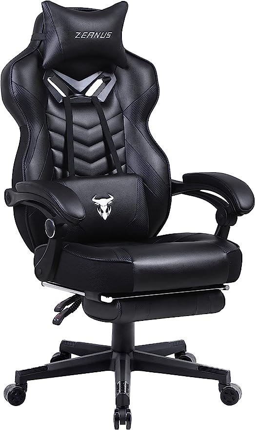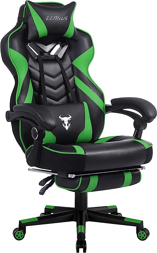 - High-Quality of High Back Gaming Chair: Thick padded of high back covered by the great quality PU leather. Adjustable massage lumbar support and headrest pillows protecting your back and neck. High back gaming chair provides you the best break taking experience on the soft footrest when you extended to your legs. Heavy-duty nylon base with smooth-rolling casters eble this chair to 360 degrees of swivel and freely move in your space.