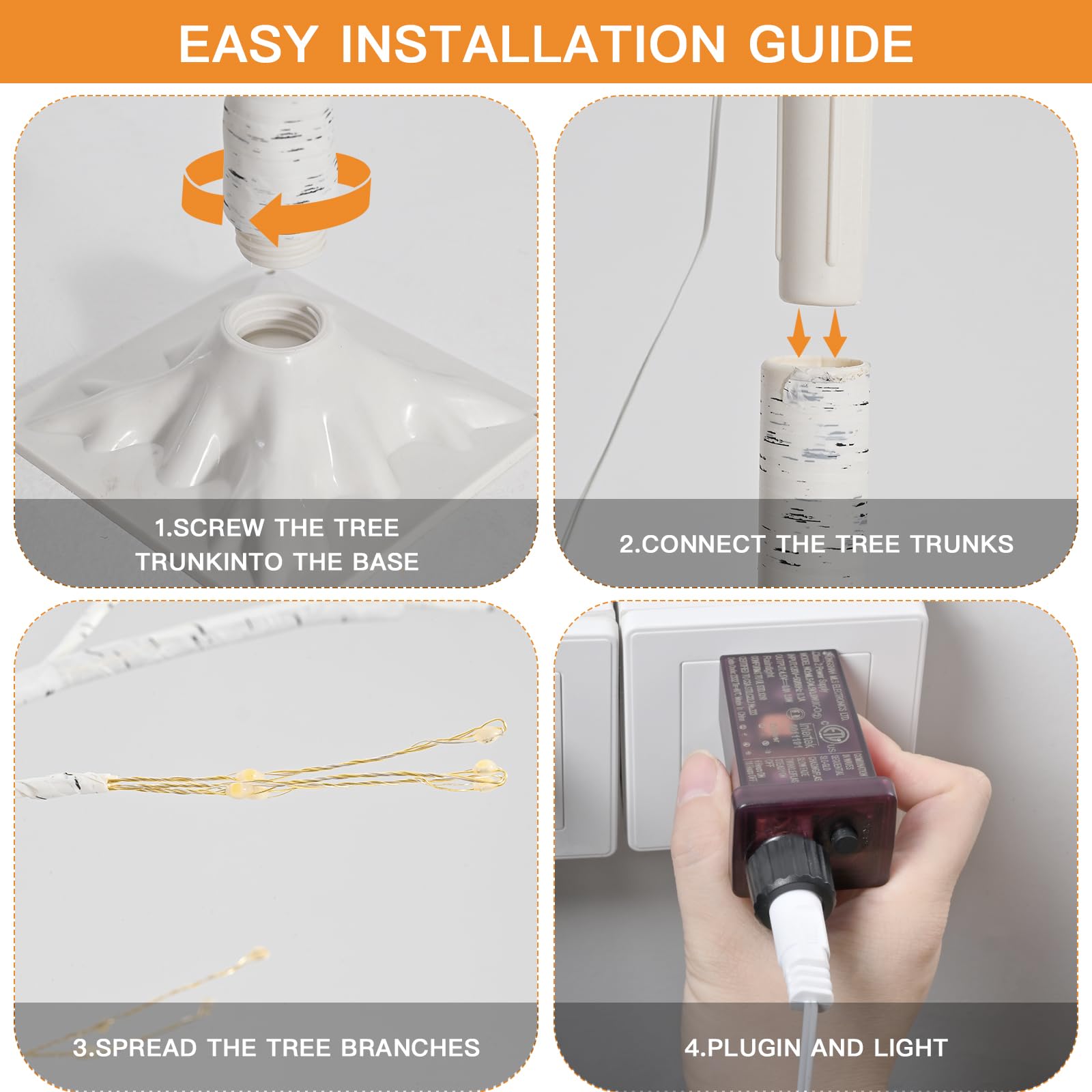 - You can use the remote control to turn on/off, change 8 lighting mode, flashing speed and 4 brightness, timing mode, very safe and easy to operate. This birch tree light adapter also has a switch function and a timing function to achieve the same functions as a remote control.