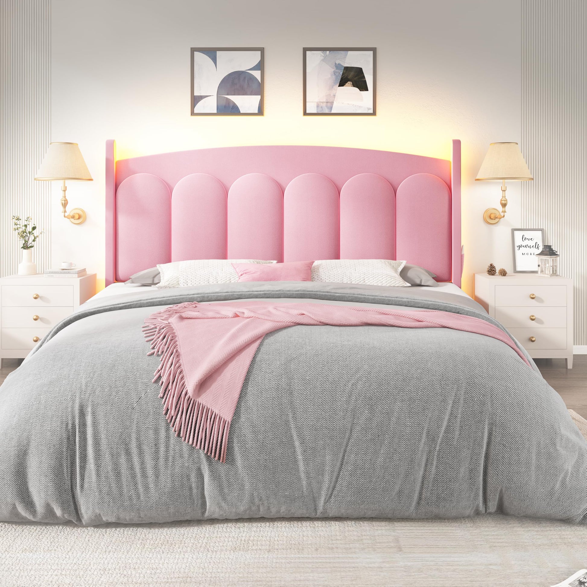Elevate your bedroom with this luxurious queen size bed frame featuring integrated LED lighting and an adjustable headboard. The plush pink velvet upholstery creates a sophisticated focal point, while the platform design with sturdy wooden slat support provides exceptional comfort and durability without requiring a box spring.