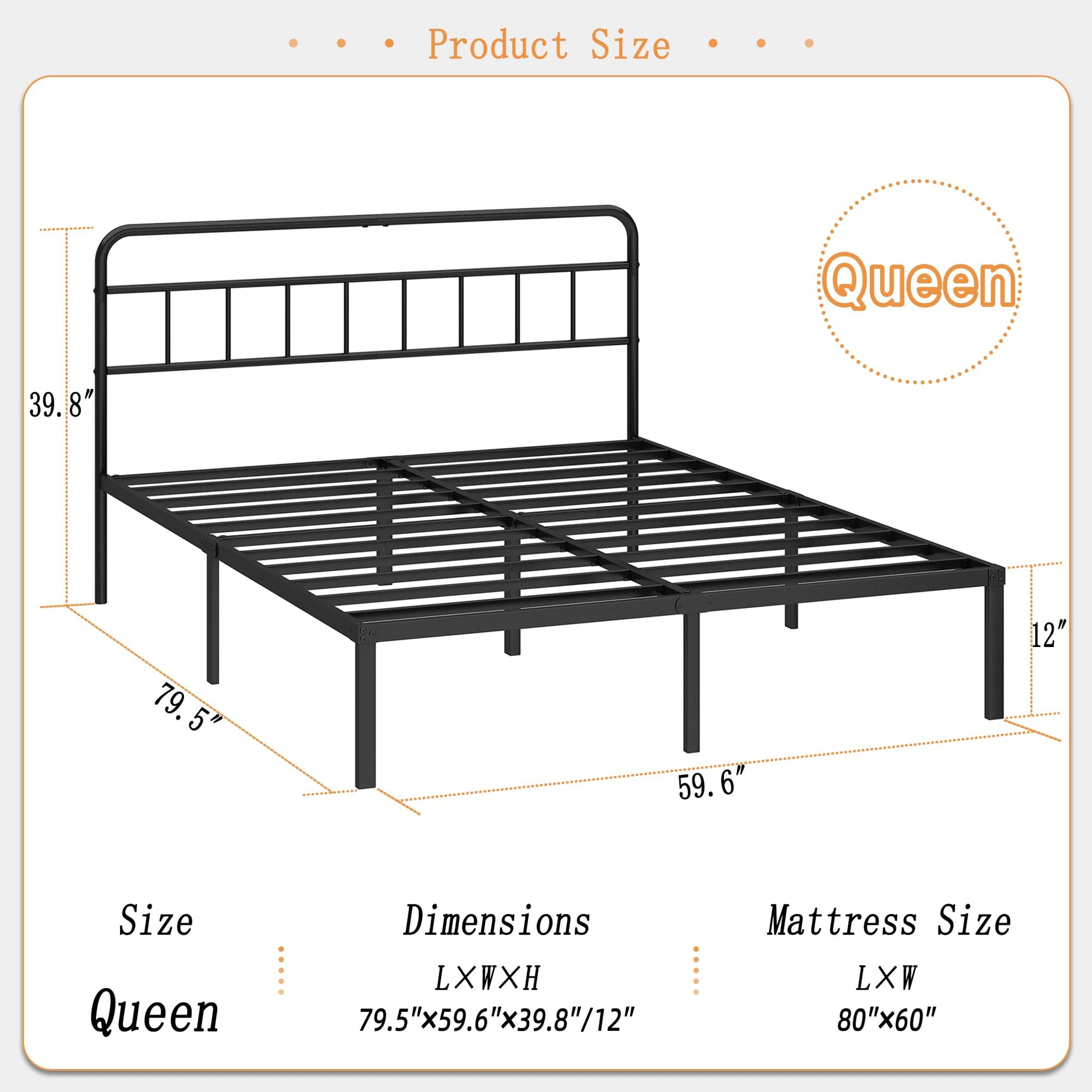 12-Inch Queen Bed Frame with Minimalist Headboard - Black Metal Platform