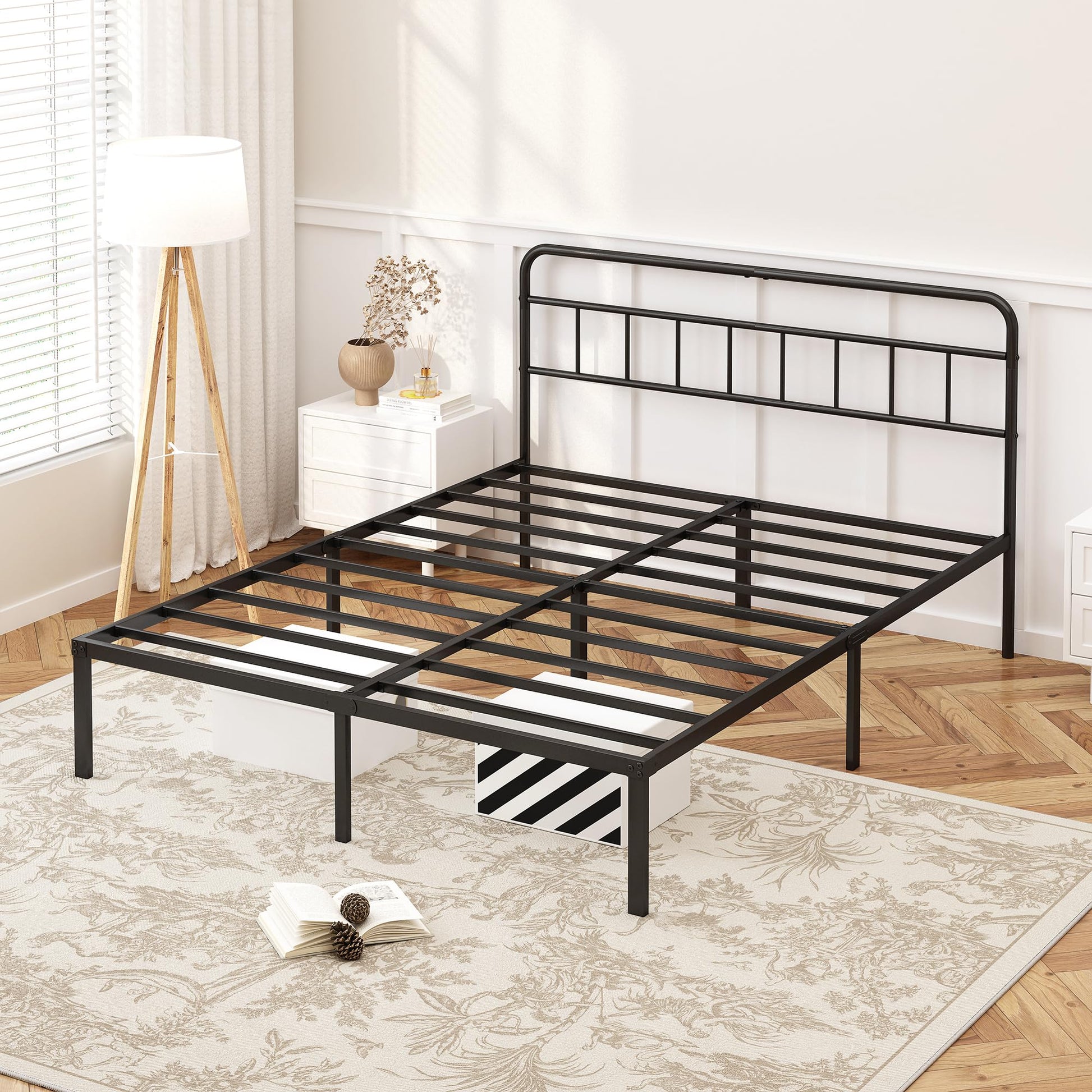 This platform bed frame is designed for those who value both form and function. The reinforced metal slat system provides exceptional mattress support, while the minimalist headboard adds a refined finishing touch to your sleep sanctuary.