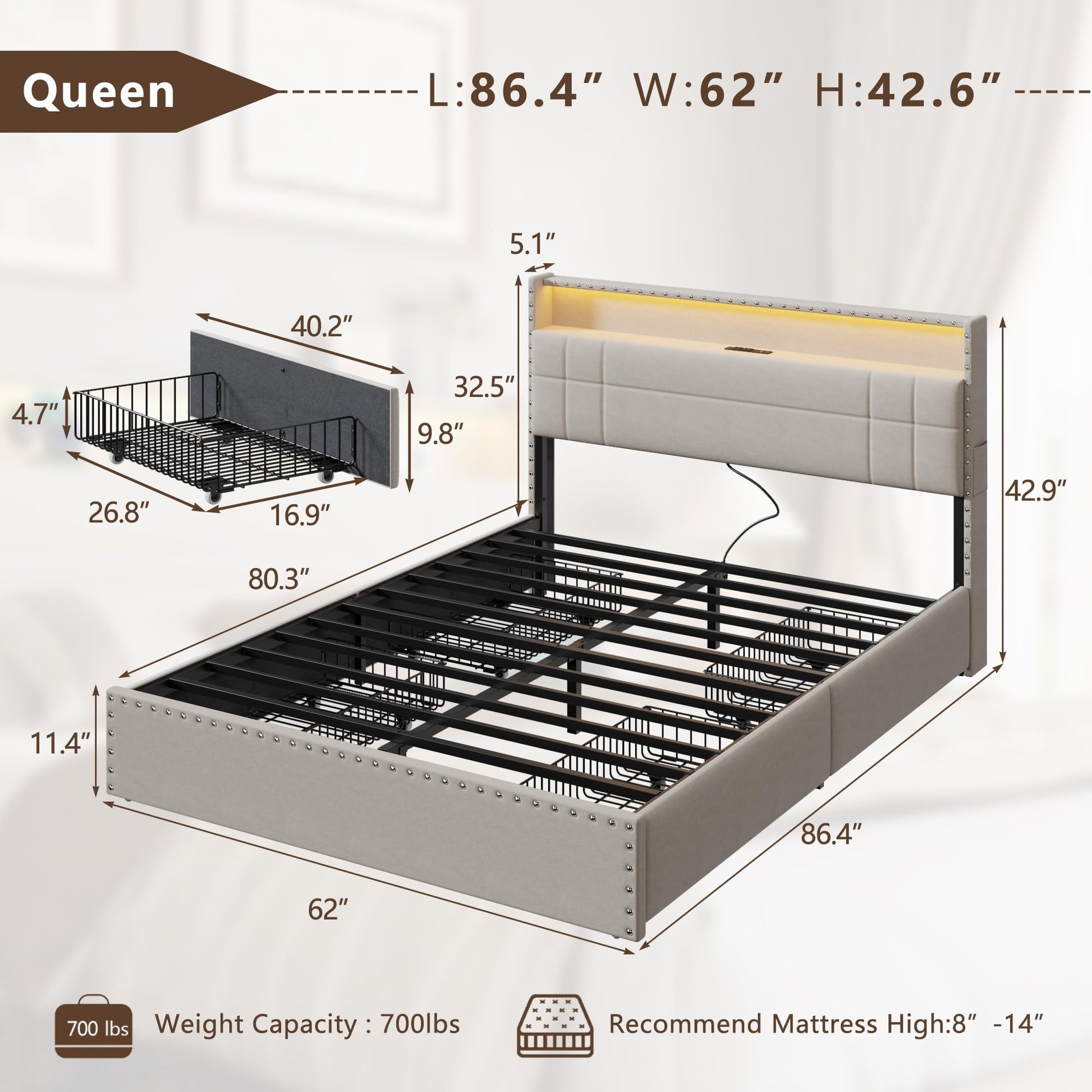 | Bed Size | Queen (fits standard queen mattress 60" x 80") |