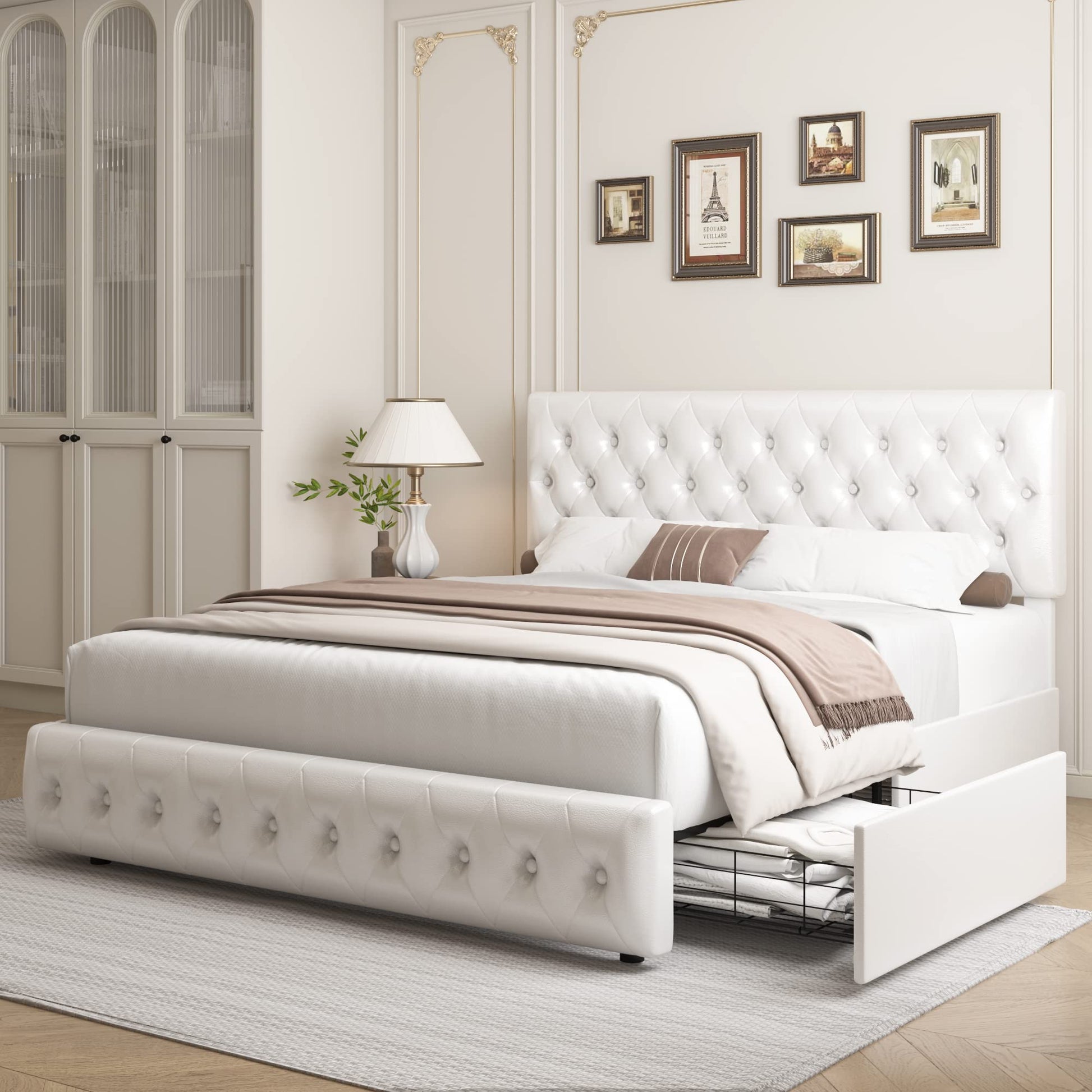 - 4 Big Storage Drawers: Featured with 4 drawers under the bed, Solution for saving space, perfect for storing bed sheets or off-season clothing. under the drawer4 casters and Button design on the top of the drawer that can be inserted into the edge of the bed to prevent sliding. The drawer dimension is L29.5*W20.5*H5.1