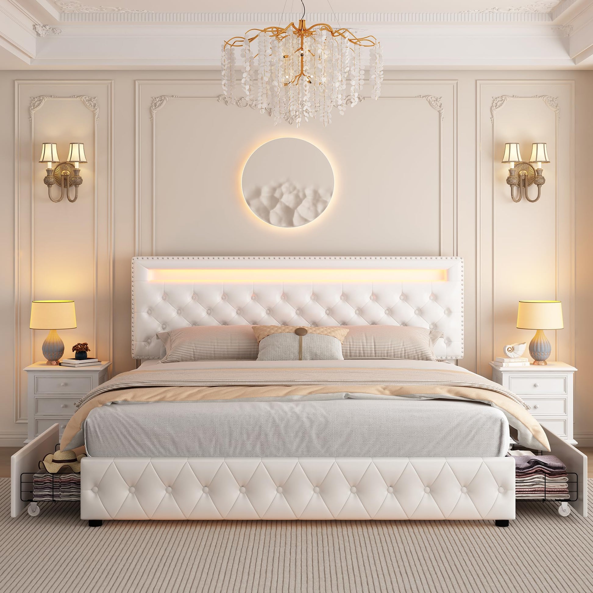 Queen Led Bed Frame with 4 Storage Drawers, with Smart Control RGBW LED Lights Headboard Footboard,