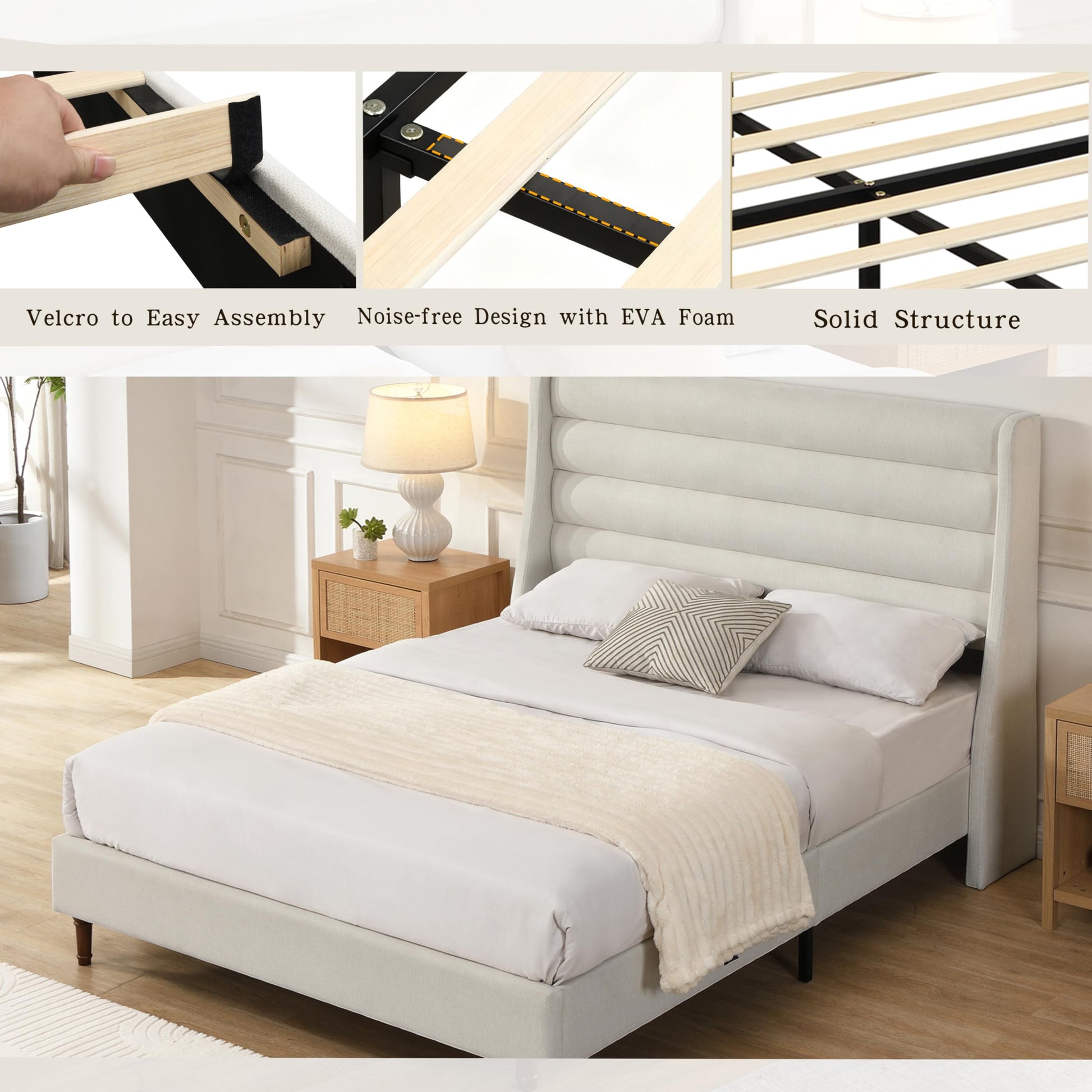 Transform your bedroom into a luxurious retreat with this stunning queen platform bed. The distinctive 53-inch wave-shaped wingback headboard creates a sophisticated focal point, while the soft chenille upholstery in ivory adds warmth and texture to your space.