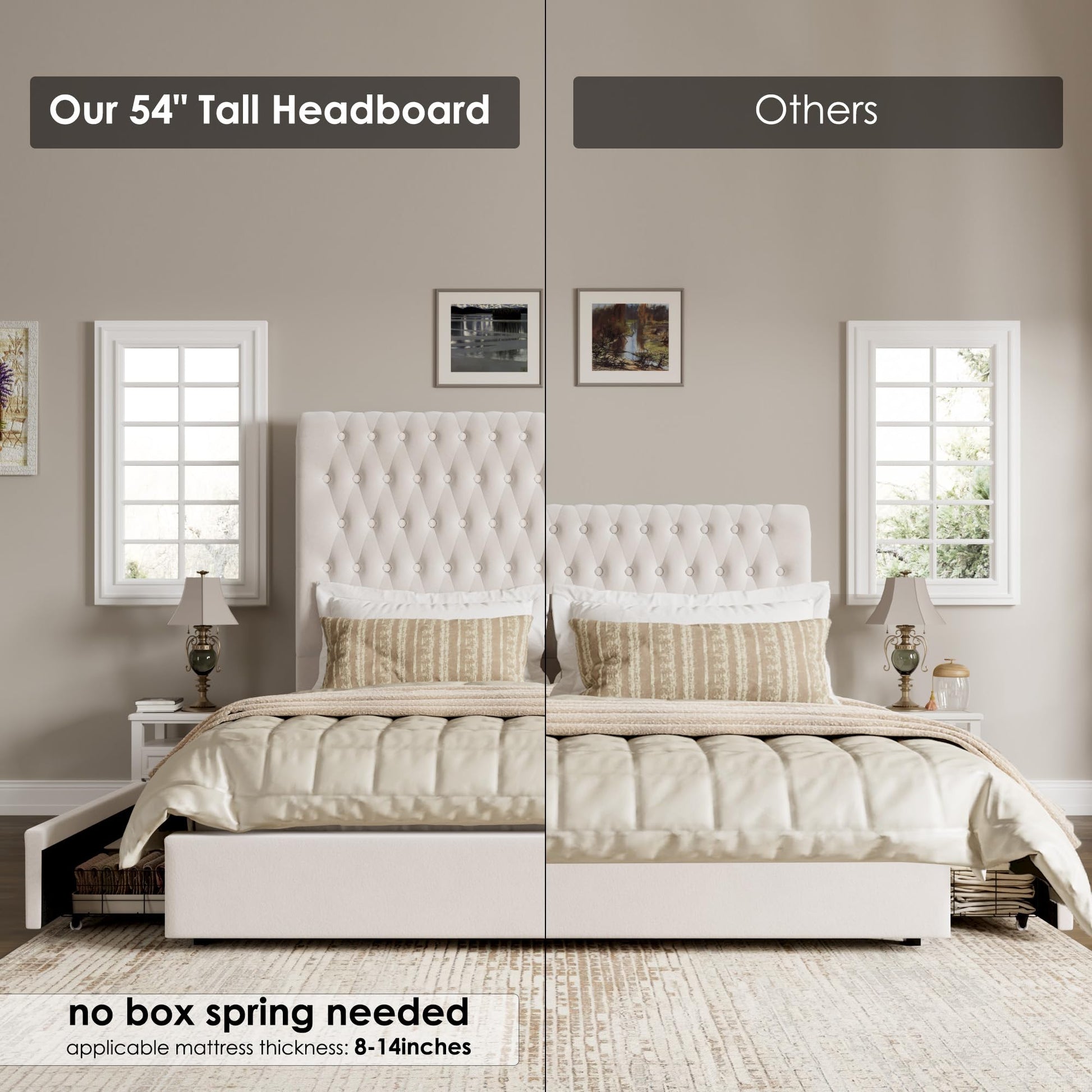 Transform your bedroom into a luxurious retreat with this elegant queen-size upholstered bed frame. Featuring a stunning 54-inch tall headboard with button-tufted detailing and decorative nailhead trim, this bed combines sophisticated design with practical functionality. The plush velvet fabric in beige creates a warm, inviting atmosphere while four spacious under-bed storage drawers provide convenient organization for bedding, clothing, and accessories.