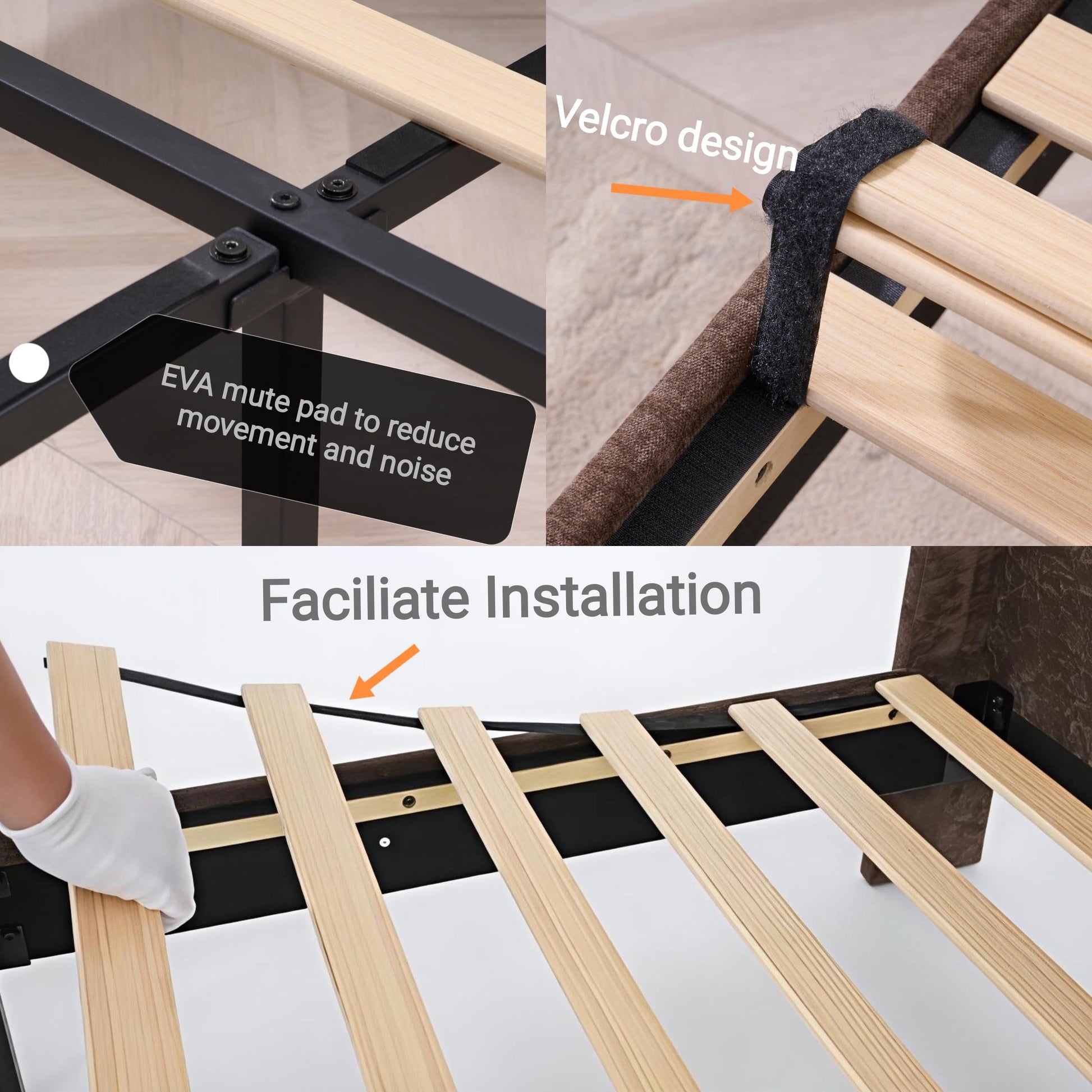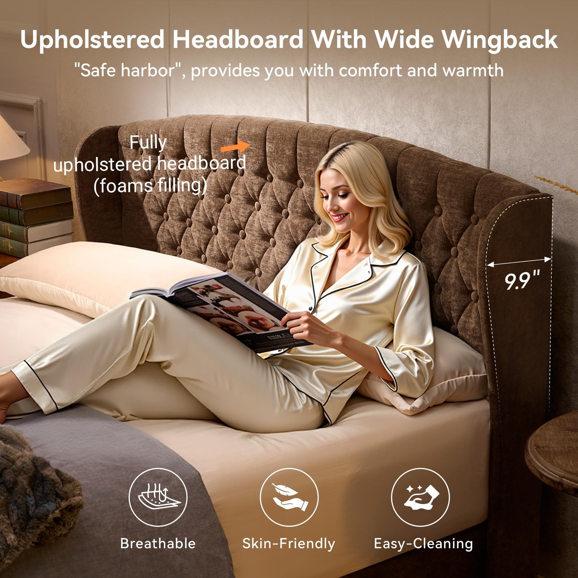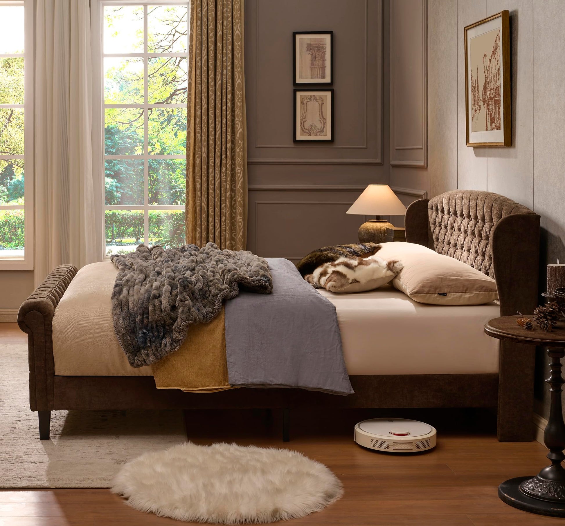 Elevate your bedroom with this elegant upholstered platform bed frame, featuring a sophisticated sleigh design with scroll footboard. Crafted with premium velvet upholstery in vintage brown, this bed combines timeless aesthetics with modern functionality.