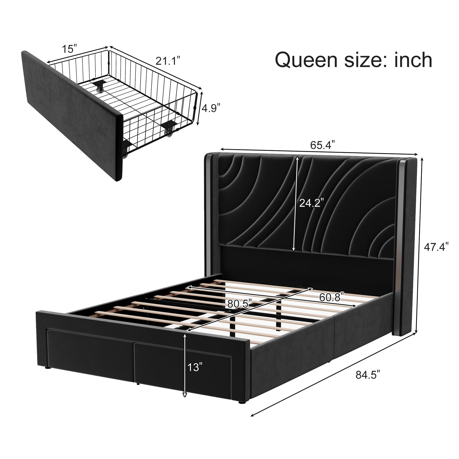 Queen Size Velvet Upholstered LED Platform Bed with Storage Drawers