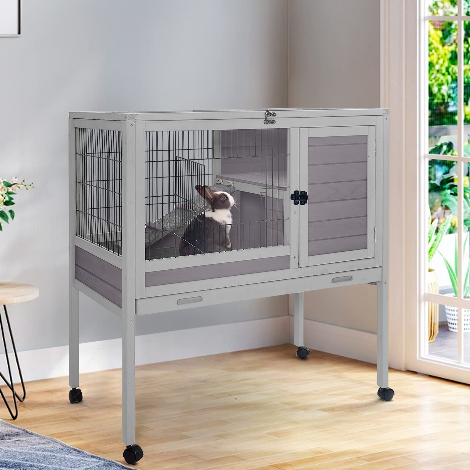 - Rabbit house with DEEPER removable pull out not leak plastic tray for easy clean.