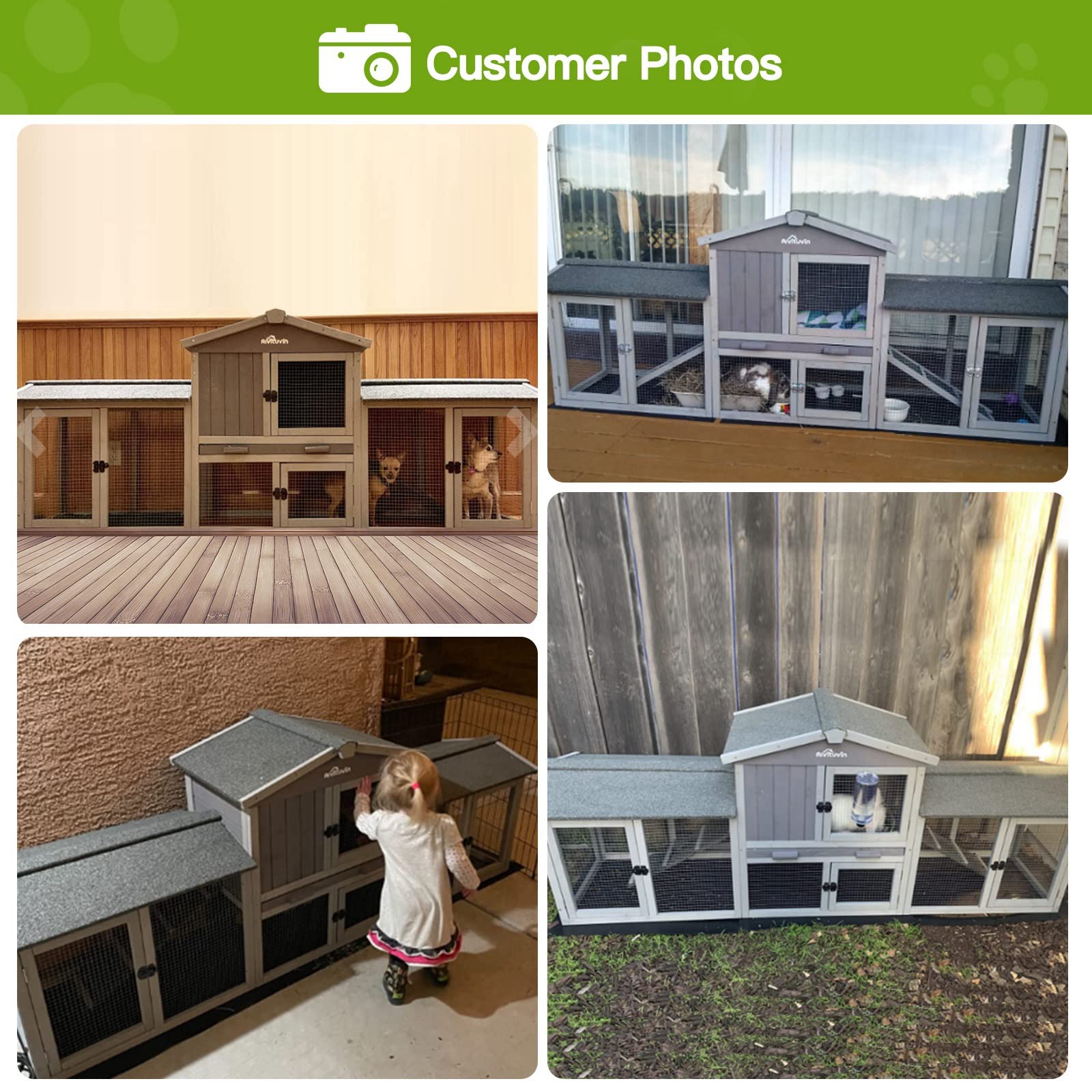 - Solid fir wood with water resistant and anti insolation painted,Weatherproof asphalt sloping roof to protect the bunny cage away from bad weather,for long time indoor outdoor use.