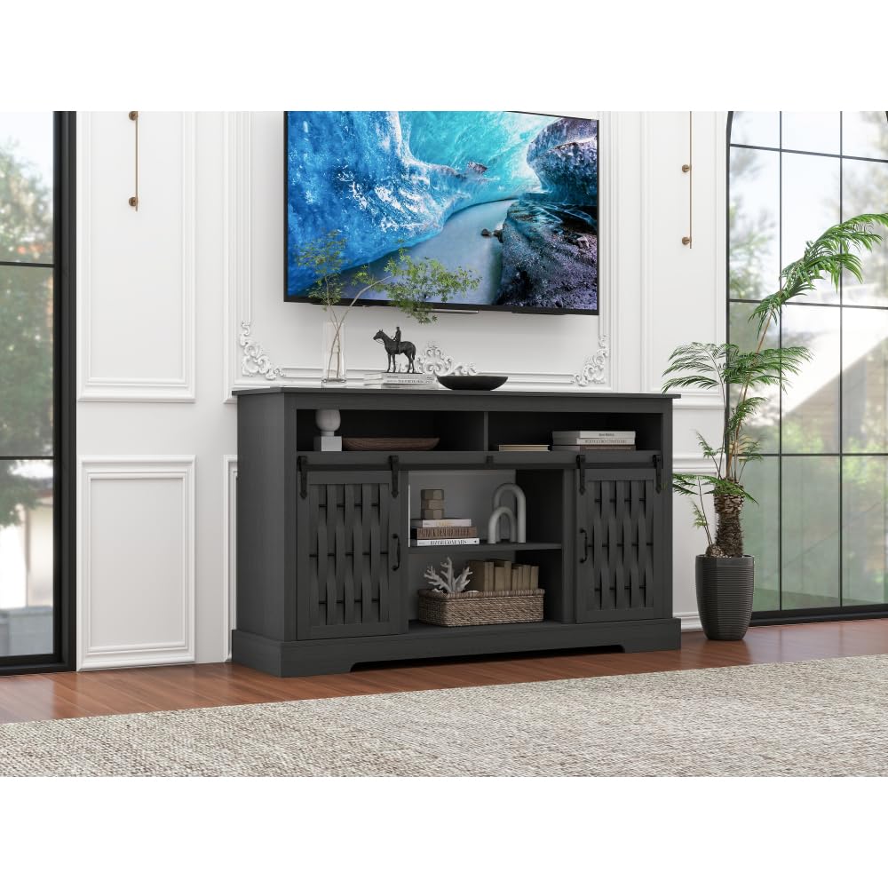 - 58.03 “Wx15.75 ‘Dx34.25 ’H,Countertop fits TV sizes up to 65 inches with 2 sliding barn doors, industrial style matte black metal hardware, easy access to cabinets and shelves with metal slides, smooth and quiet sliding.