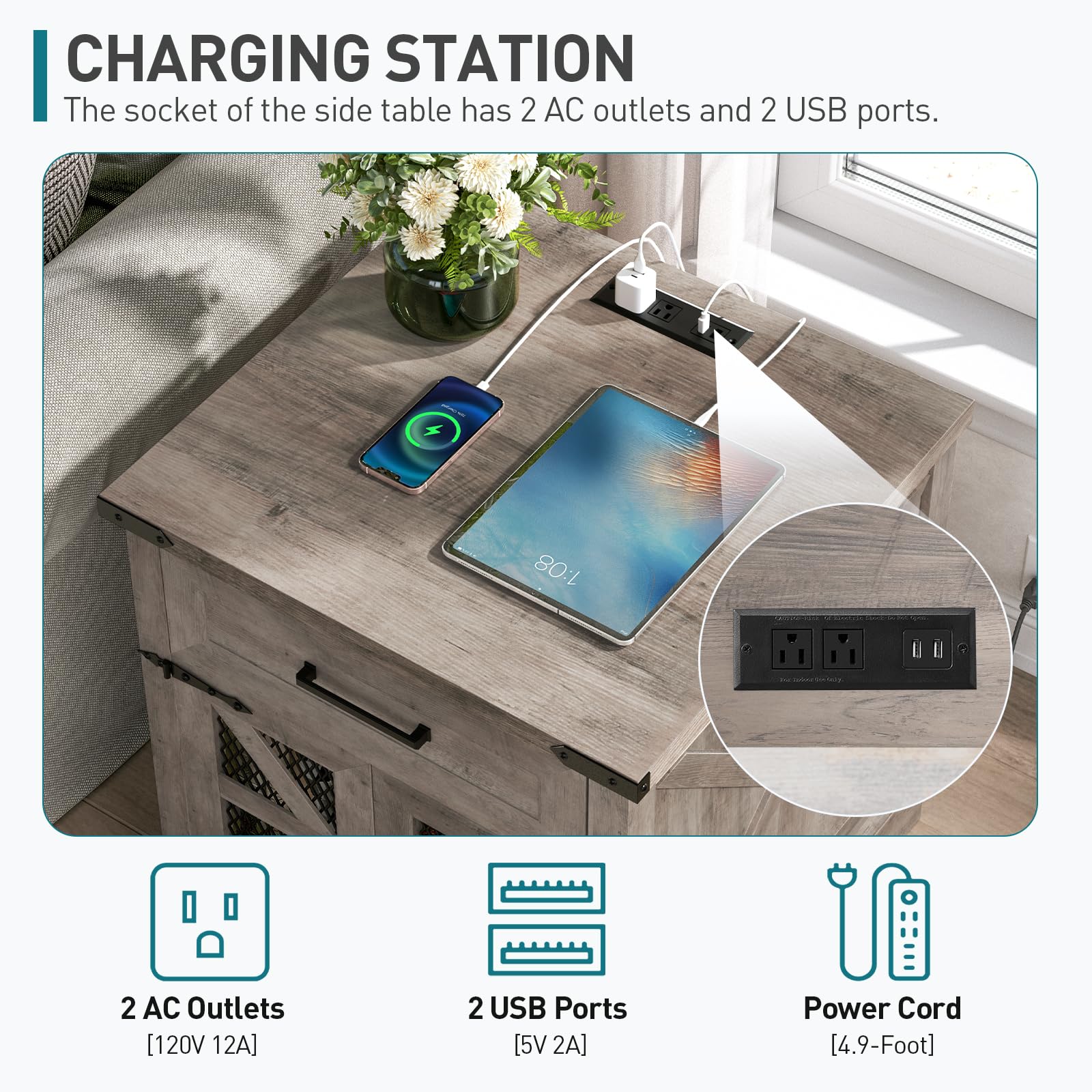 - Charming Farmhouse Style: Blending rustic, natural, and cozy elements, this farmhouse end table with charging station elevates your home decor with L-shaped metal accents, a mesh barn door design, and diamond-shaped handles while maintaining its decorative feature