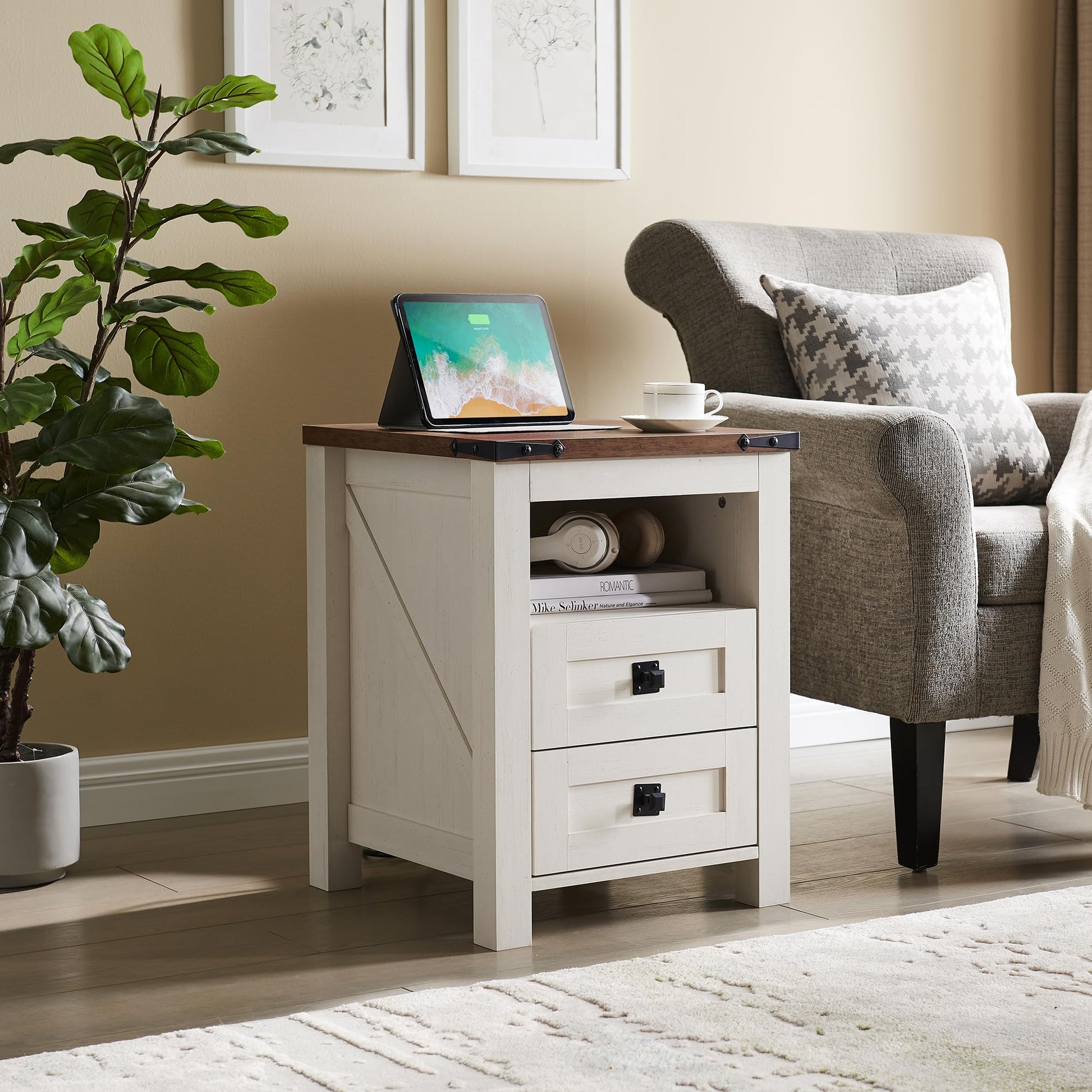 Farmhouse Nightstand with Charging Station, Rustic 18 Inch End Table with 2 Storage