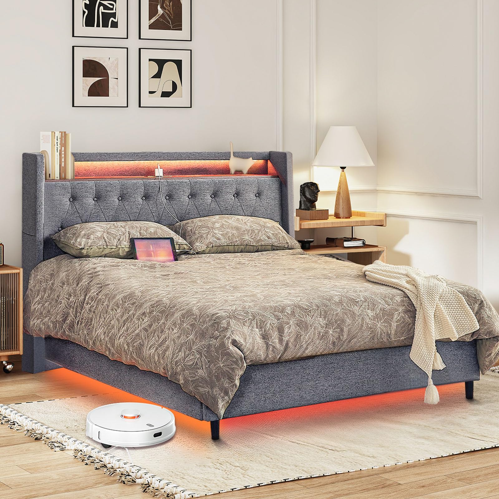 Bed Frame with LED Lights and Charging Station, Upholstered Bed Frame, Tufted Button