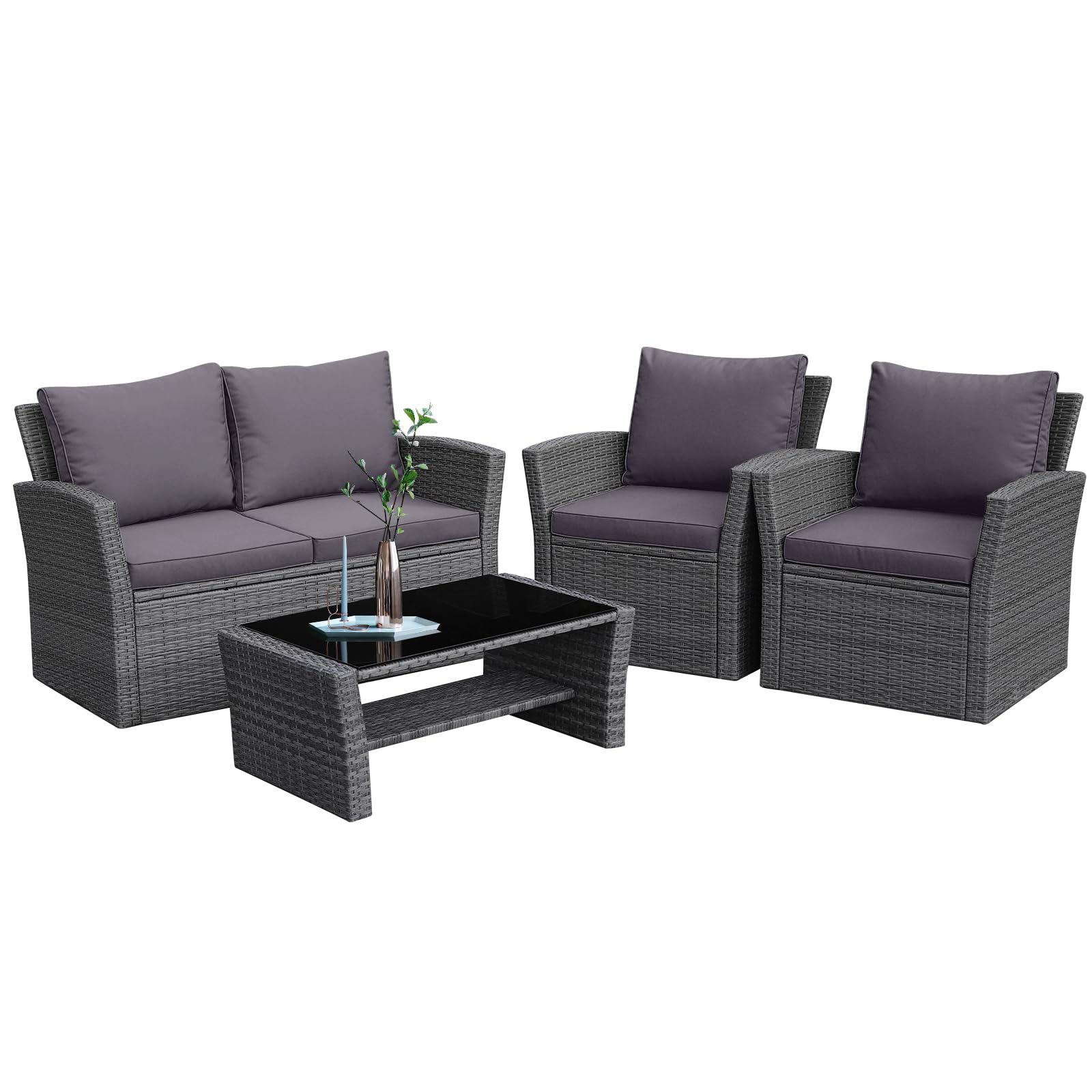 4 PCS Wicker Patio Furniture Set with Soft Cushions & Tempered Glass Table