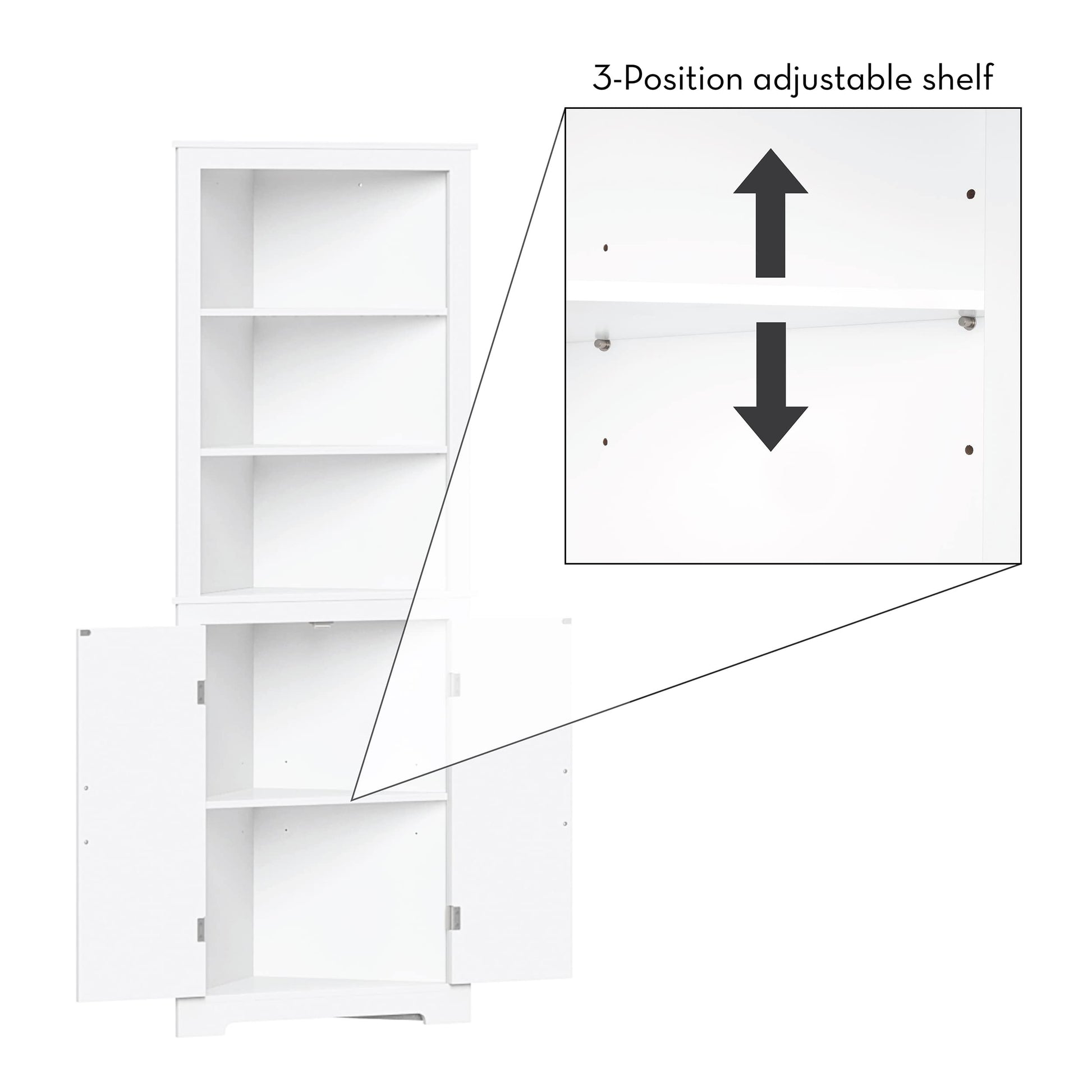 - Spacious corner cabinet design features both open and interior shelves for a variety of storage and display options