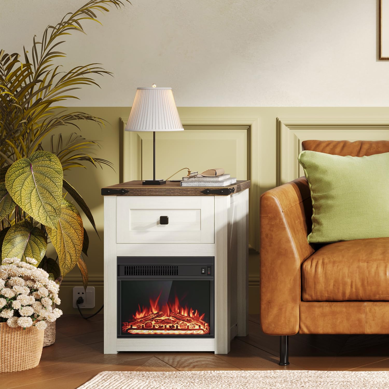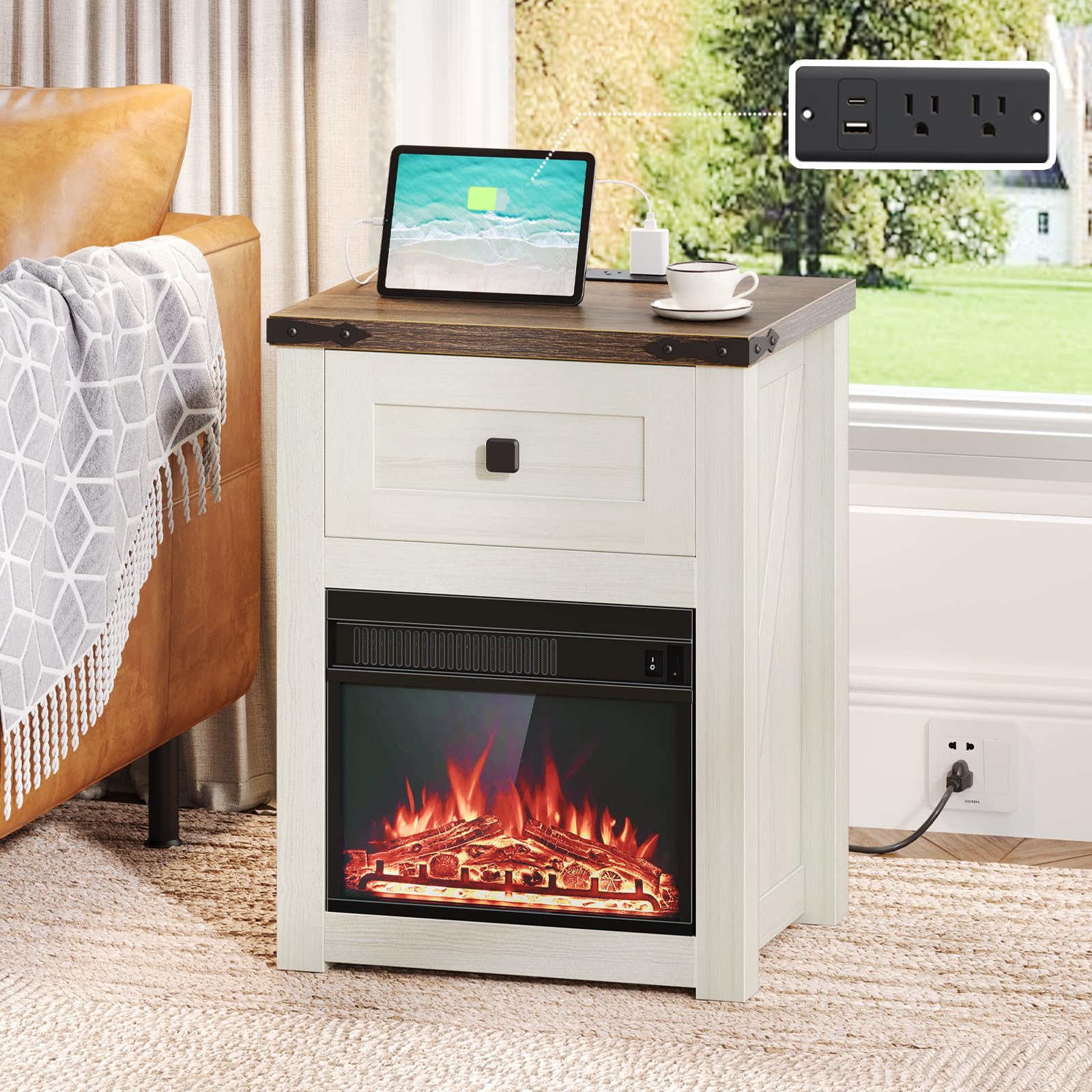 White Nightstand End Table with Charging Station, Farmhouse Fireplace End Side Table