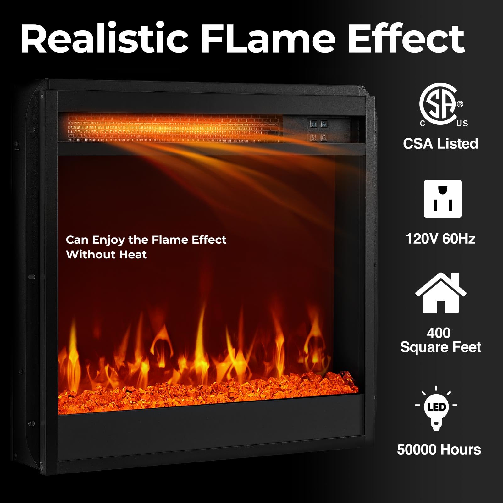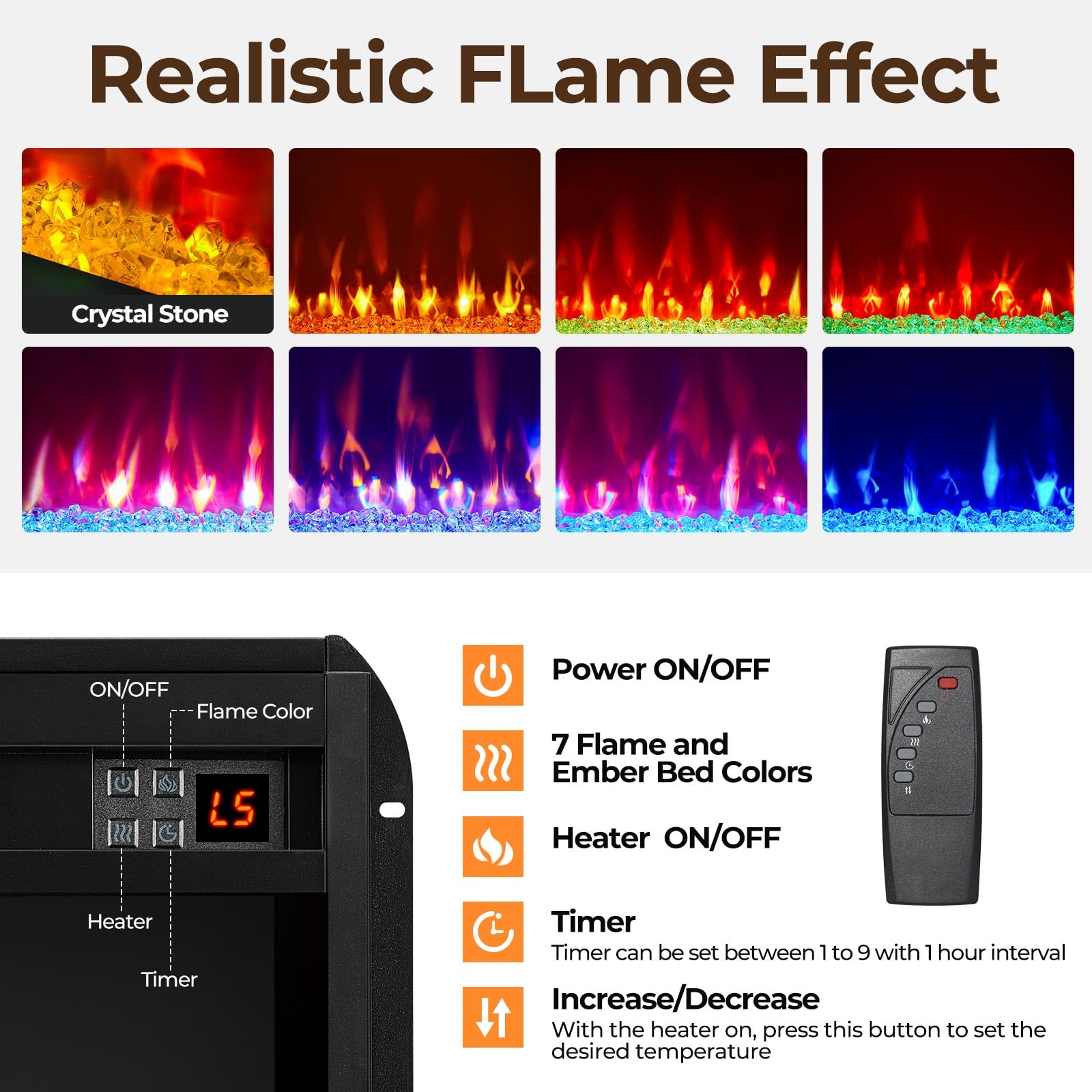 - The electric fireplace offers you a series of customized features, including heating temperature ranging from 64°F to 82°F, flame color, and timer function, which allows you to set the perfect ambiance for any occasion. It comes with an exact remote to choose 8 colors of flame and decorative crystals to brighten up your living room