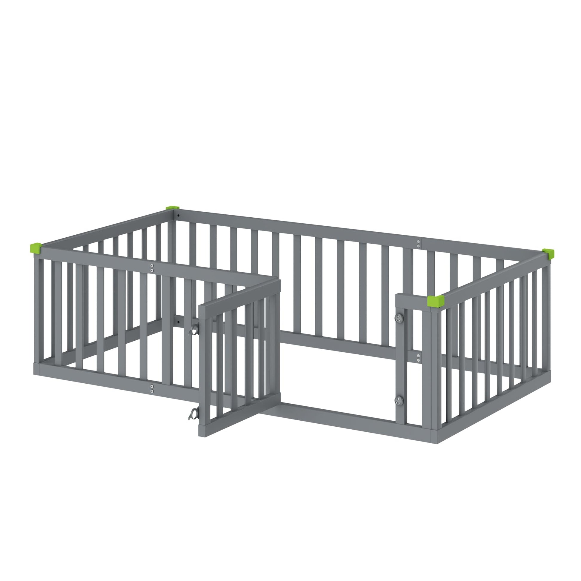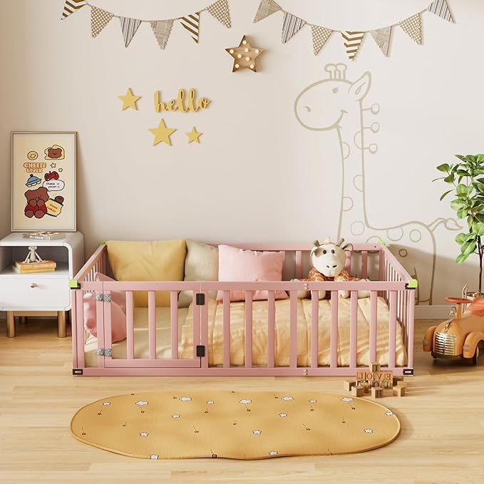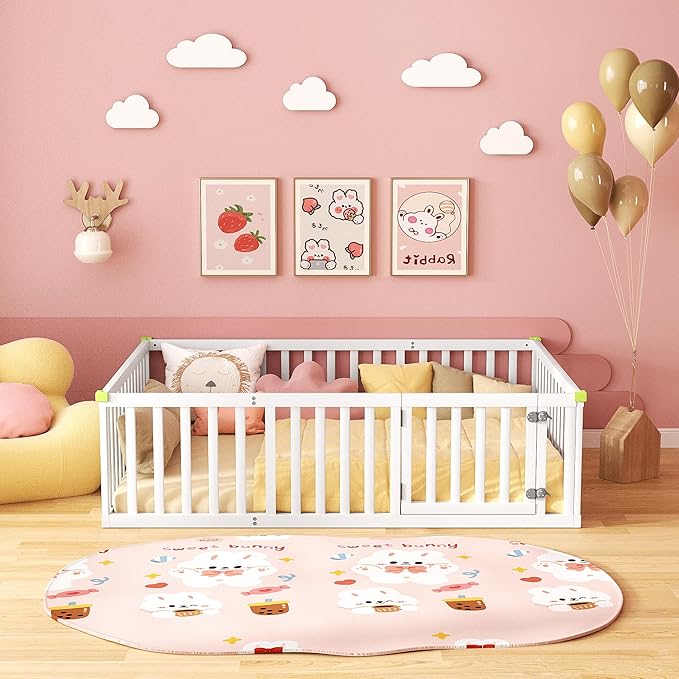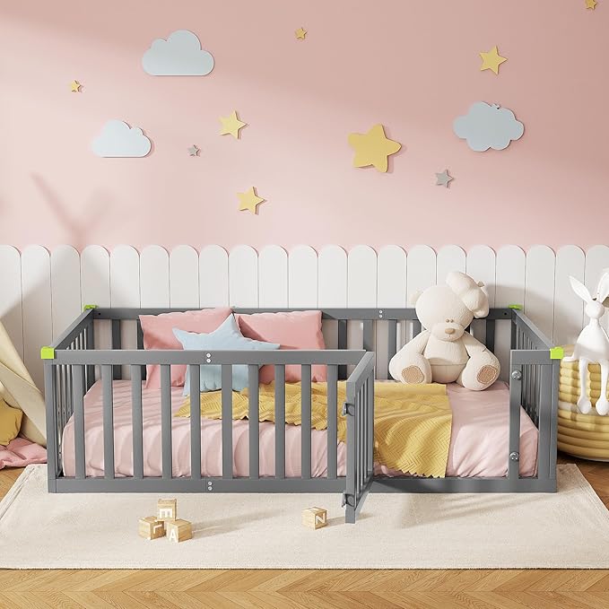 Montessori Floor Bed for Kids, Solid Wood Toddler Bed Frame w/Convertible Door