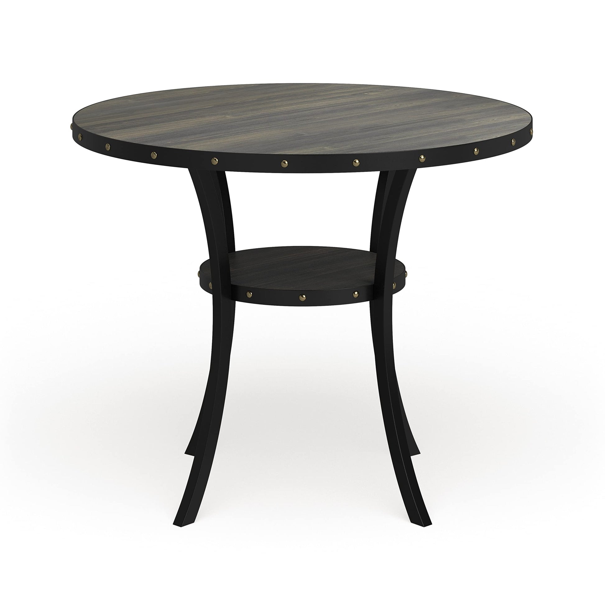 - Contemporary style round counter Height dining table highlighted with brass nail-heads for on-trend flair