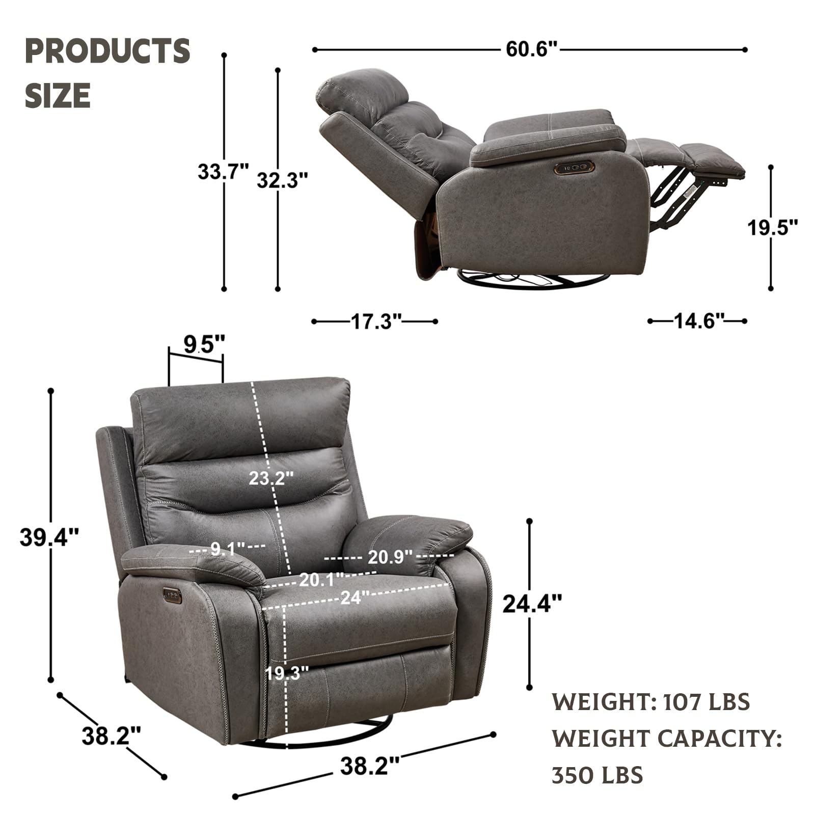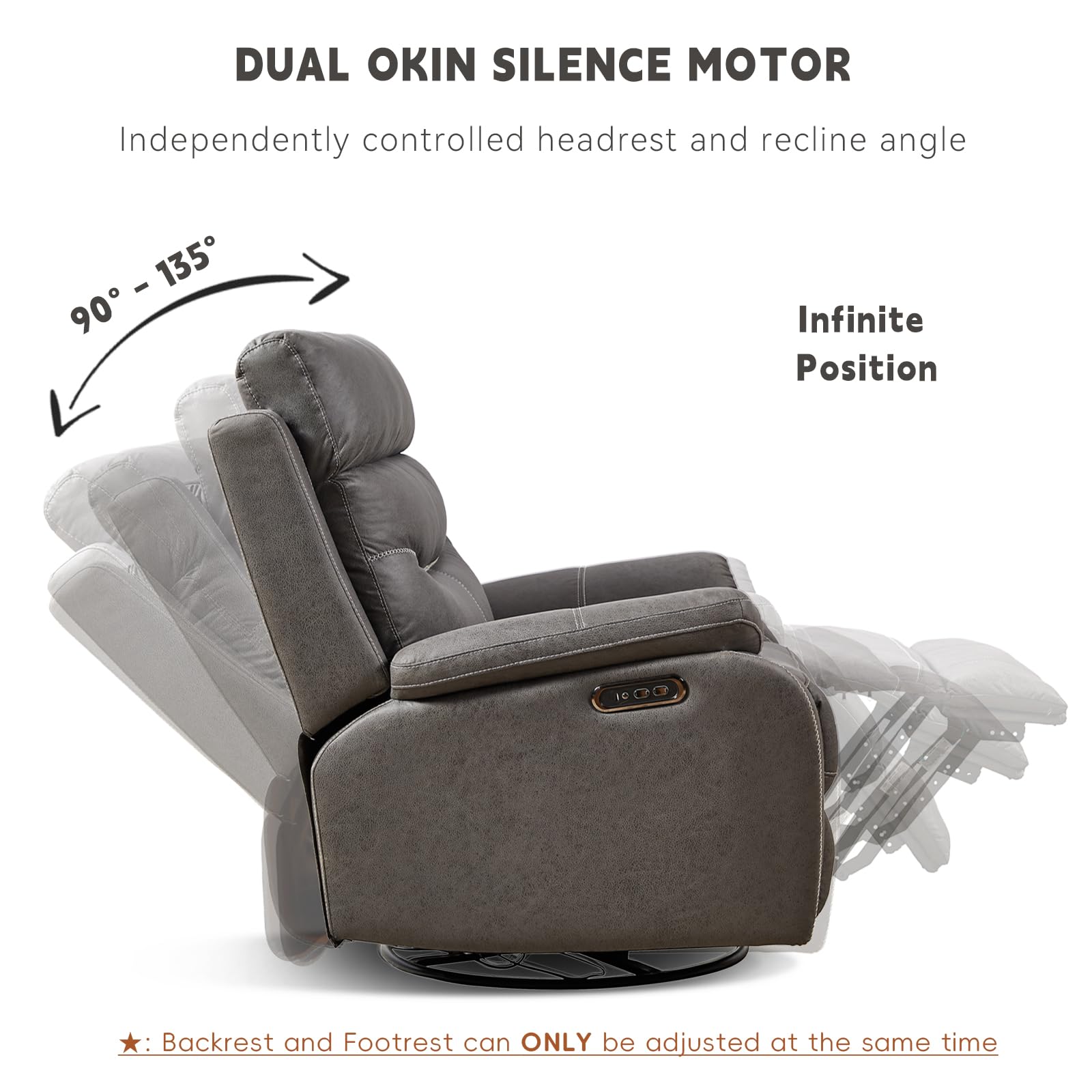 - ROYALSON power swivel recliner chair built with a powerful OKIN dual motor, can open smoothly. It is a practical solution for the elderly and people with physical limitations. The dual motor controls the adjustment angle of the headrest and recliner respectively. You can use this function to adjust the chair to the most comfortable angle that suits your body. Widened seats and backrests, skin-friendly fabric, and soft and elastic cushions give users a sense of comfort.