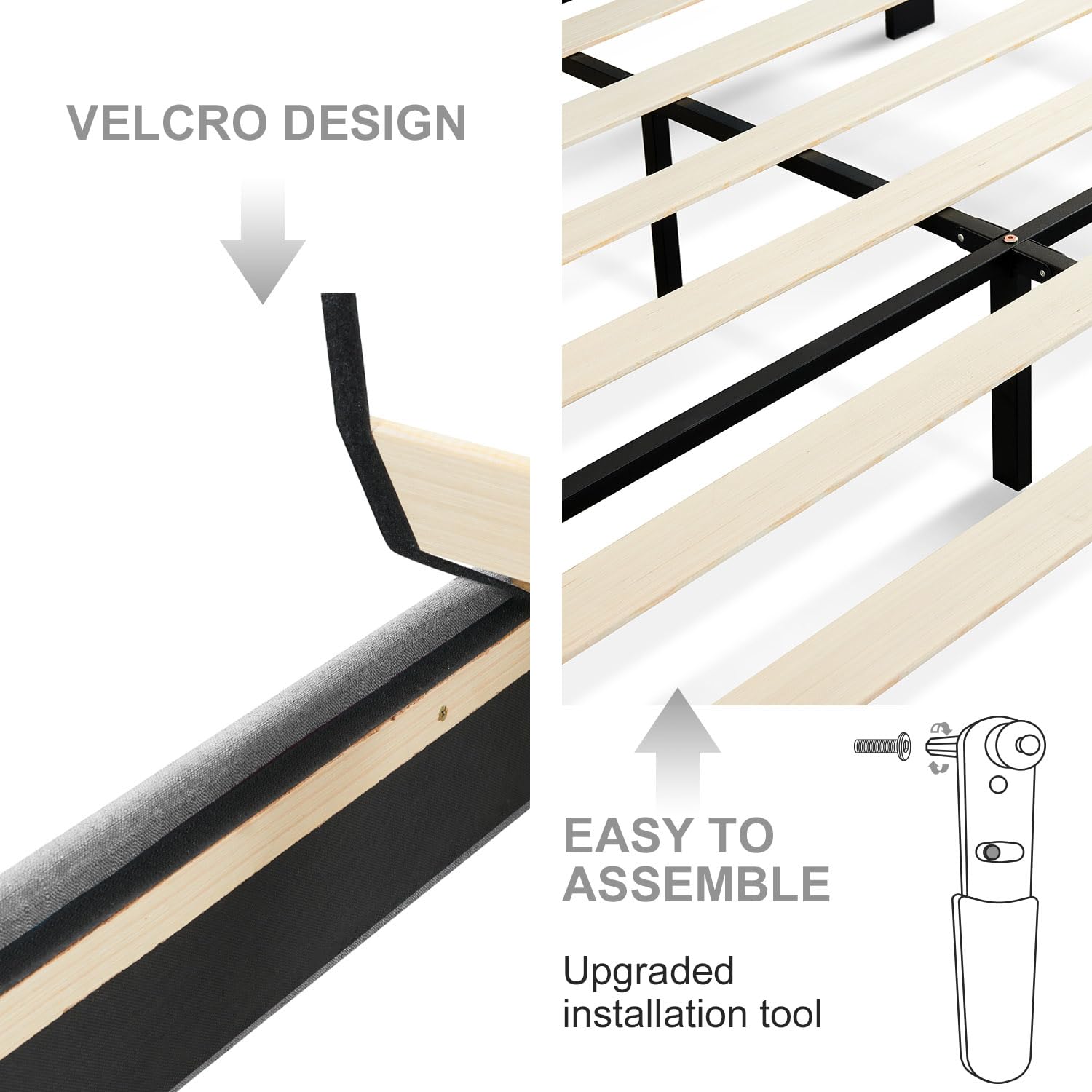 - Noise-free Design: The slats of this upholstered bed frame are specially designed with velcro to prevent friction. in addition, the foot of the metal bed frame has non-slip feet pads to protect the floor and reduce noise, giving you a quiet and comfortable resting environment.