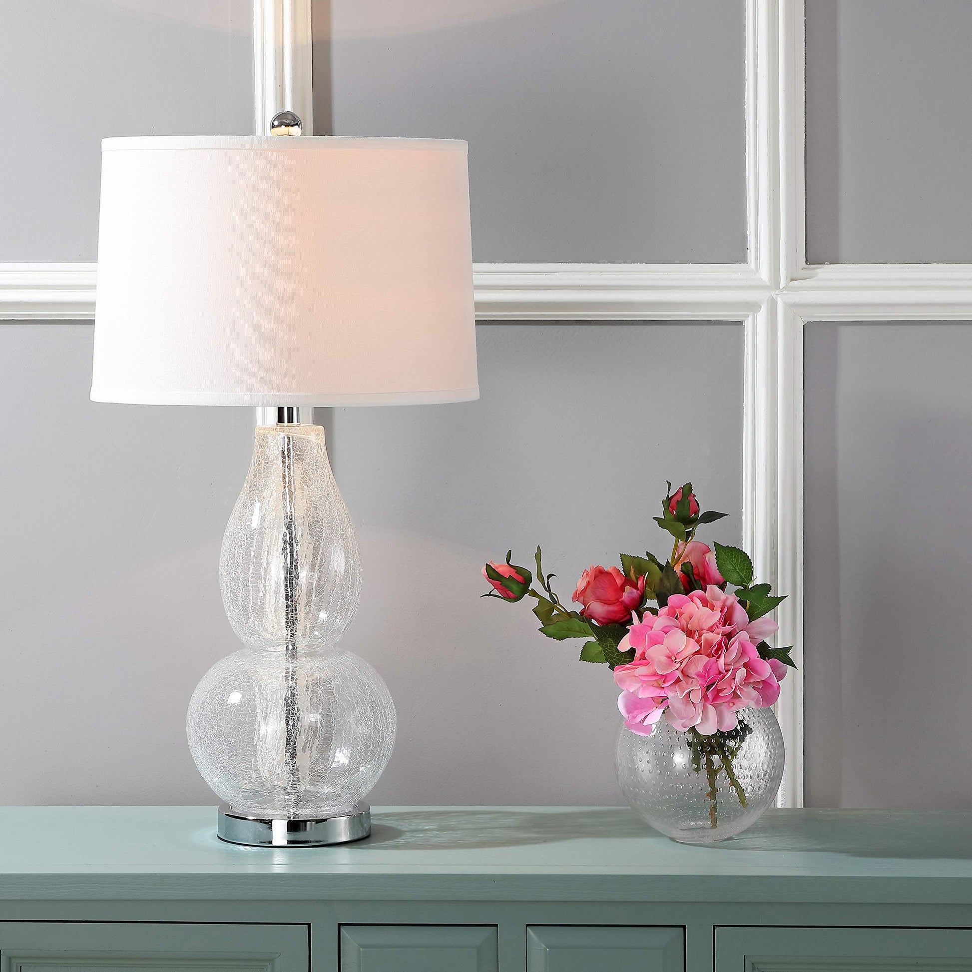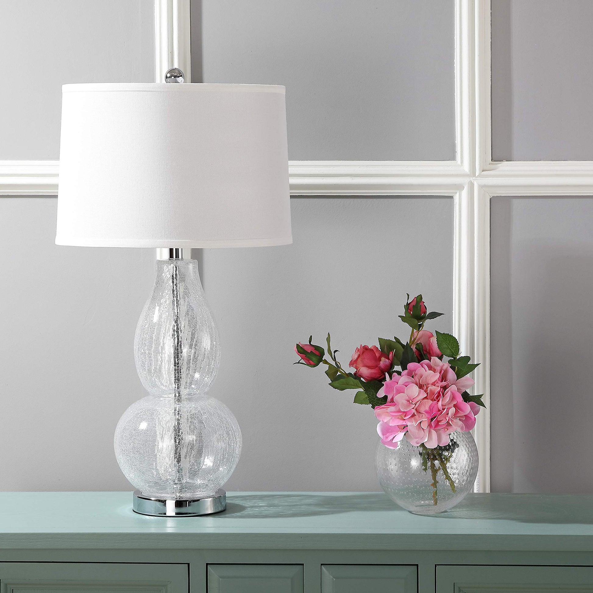 - Double gourd table lamp has vintage crackle glass accented with chrome fittings