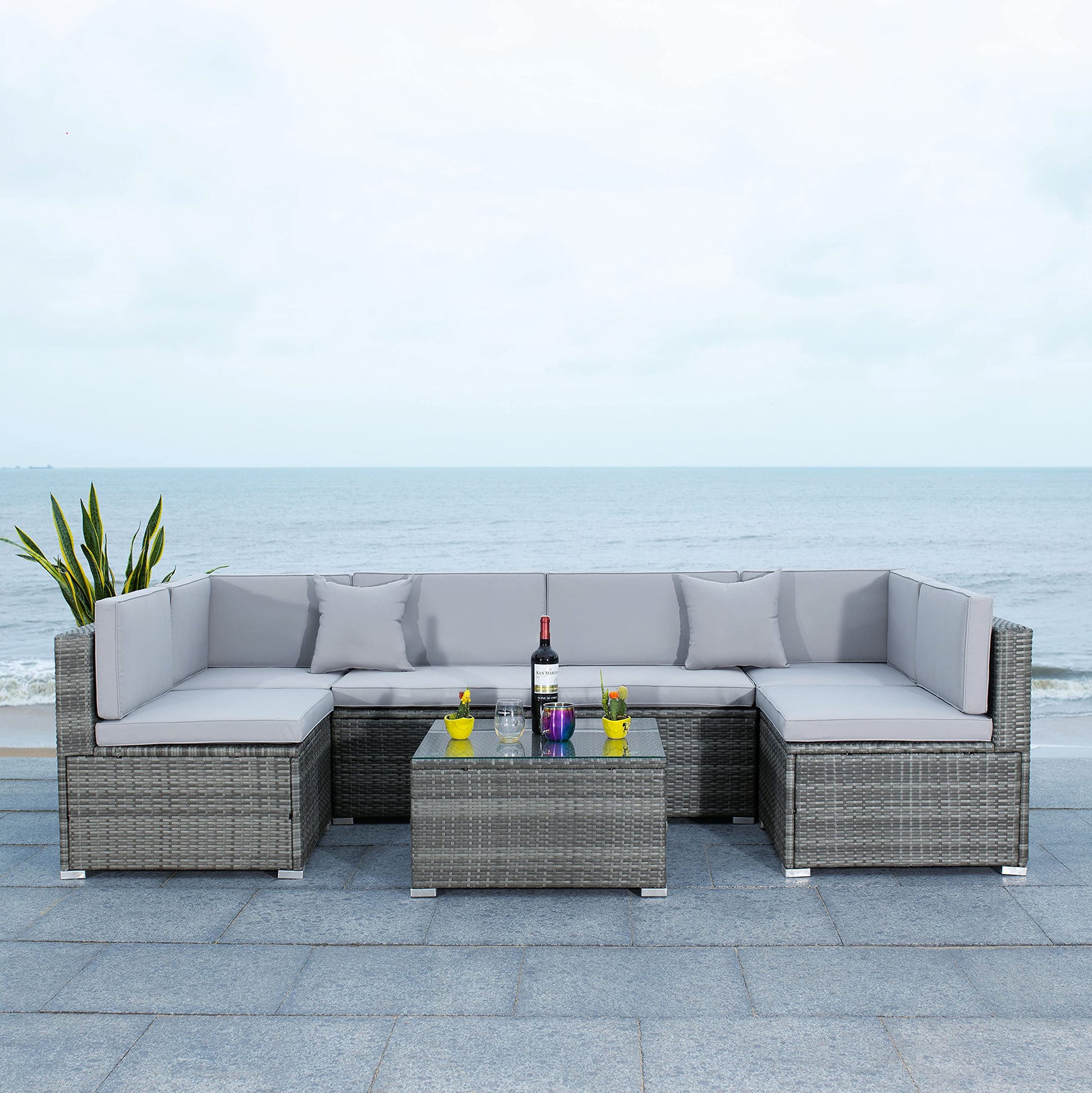 - Ultra-chic outdoor set includes one (1) six-chair sectional and one (1) glass-top coffee table