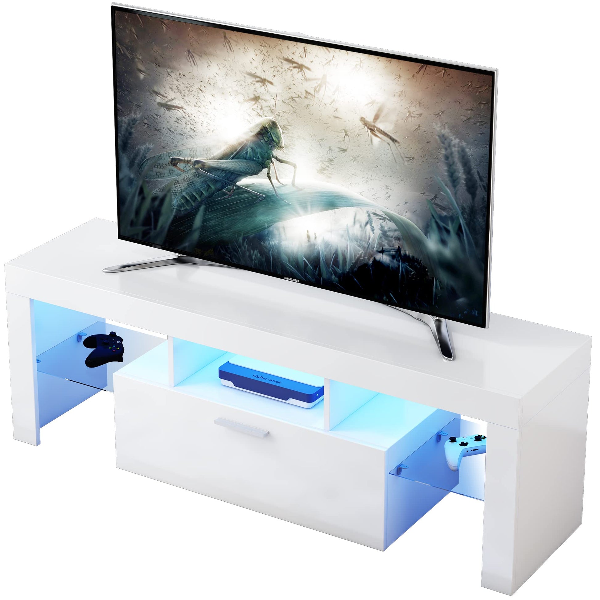 LED White TV Stand for 55 Inch TV, Modern Gaming Entertainment Center, Small Television