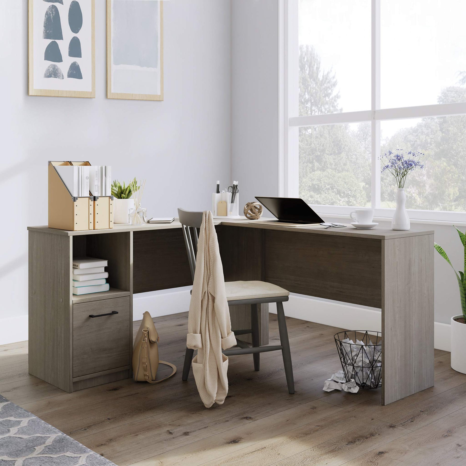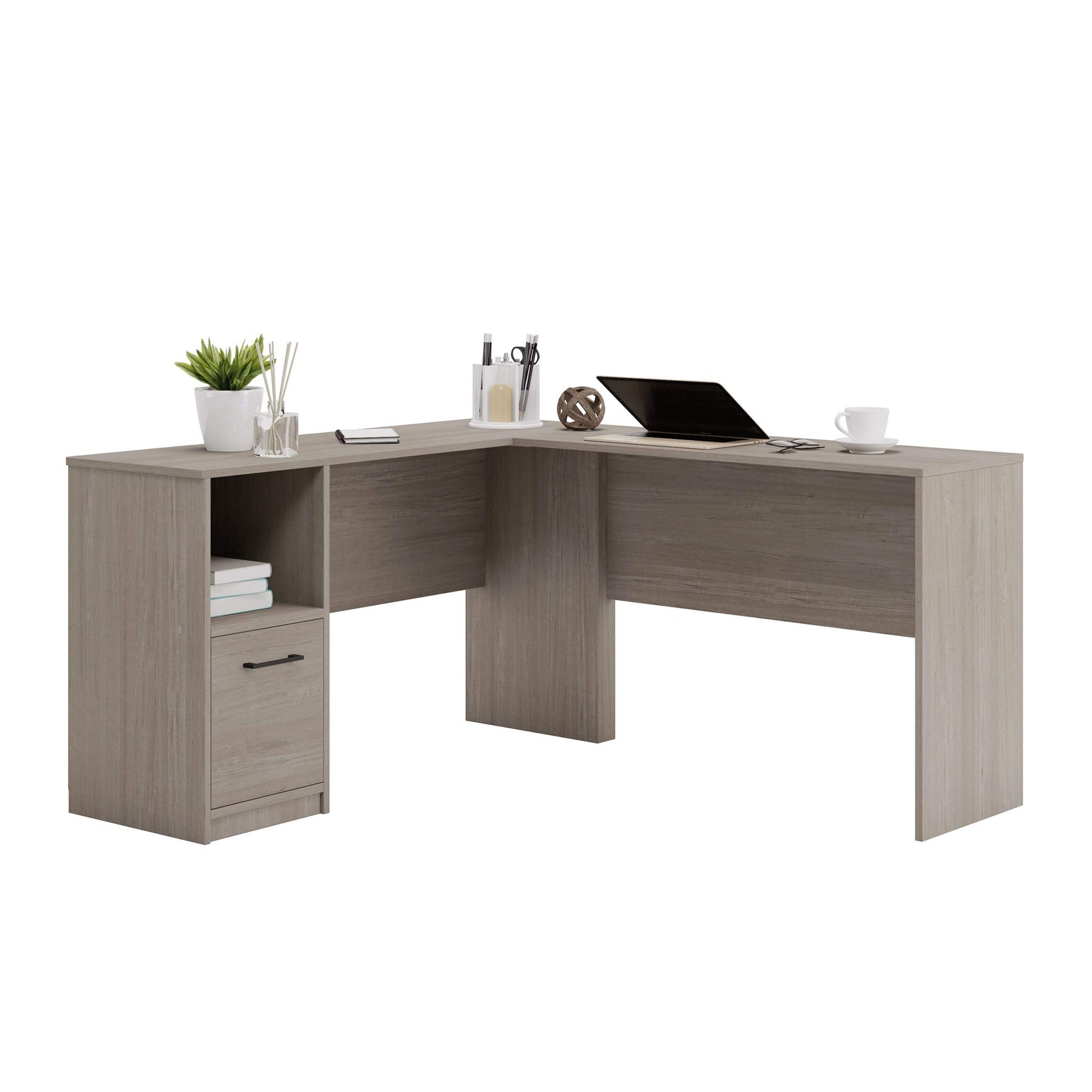 Beginnings L-Desk, L: 51.02" x W: 59.06" x H: 28.50", Silver Sycamore Finish