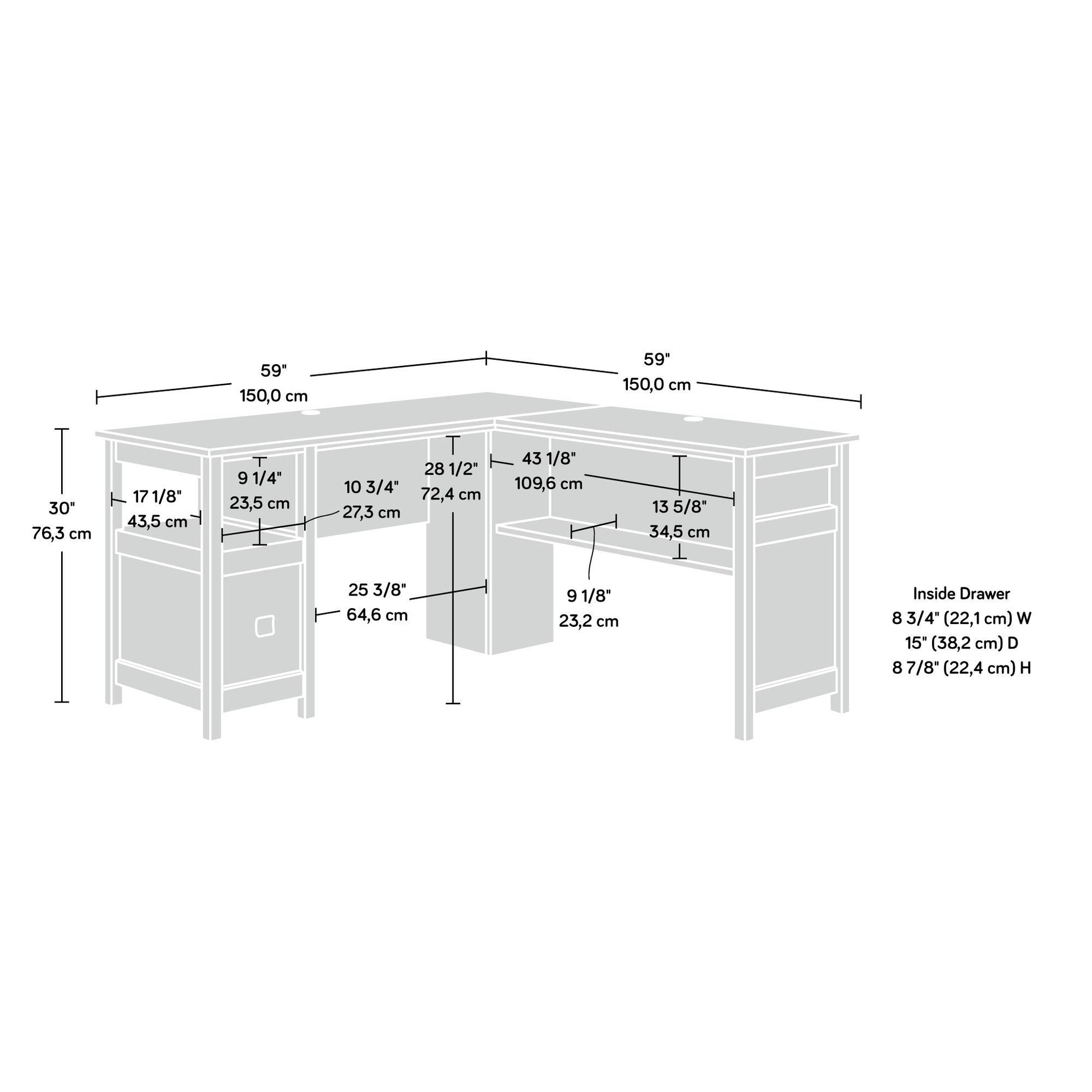 Cannery Bridge L-Desk, L: 59.06" x W: 59.06" x H: 30.04", Mystic Oak finish