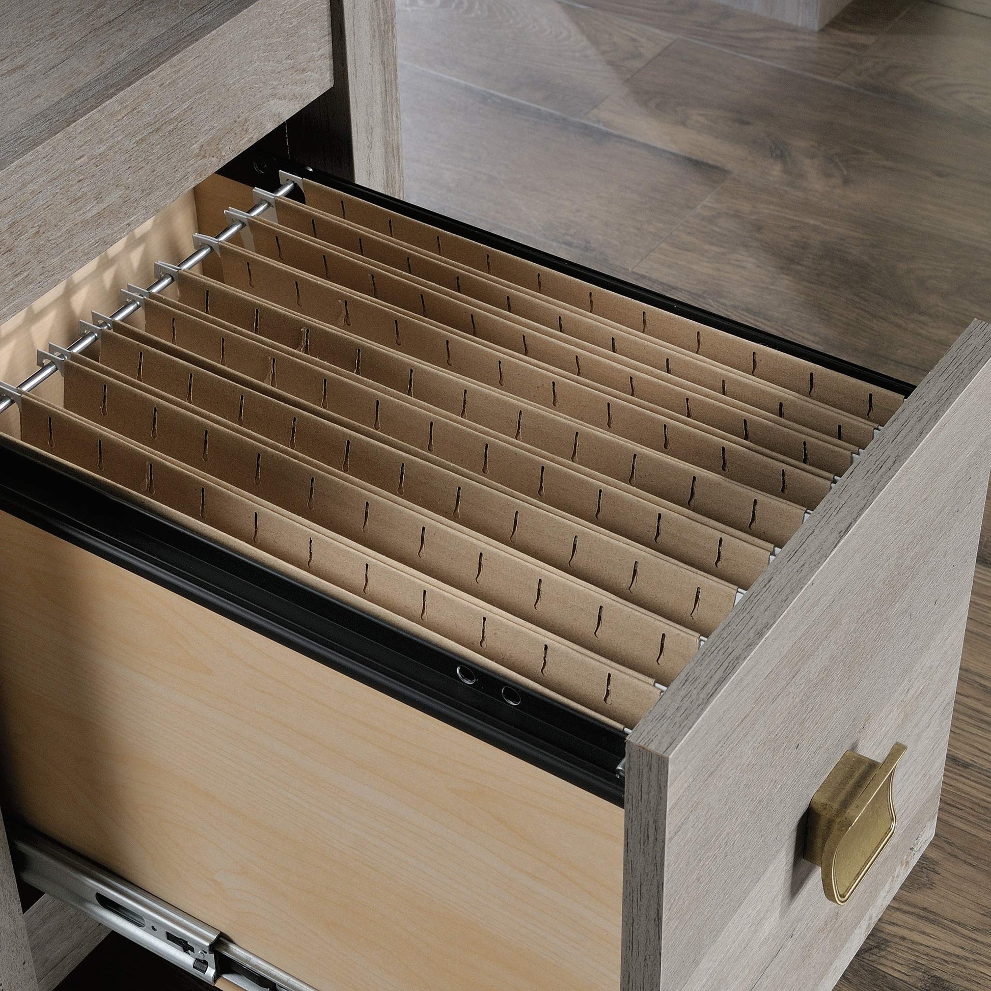 - File drawer with full extension slides holds letter-size hanging files