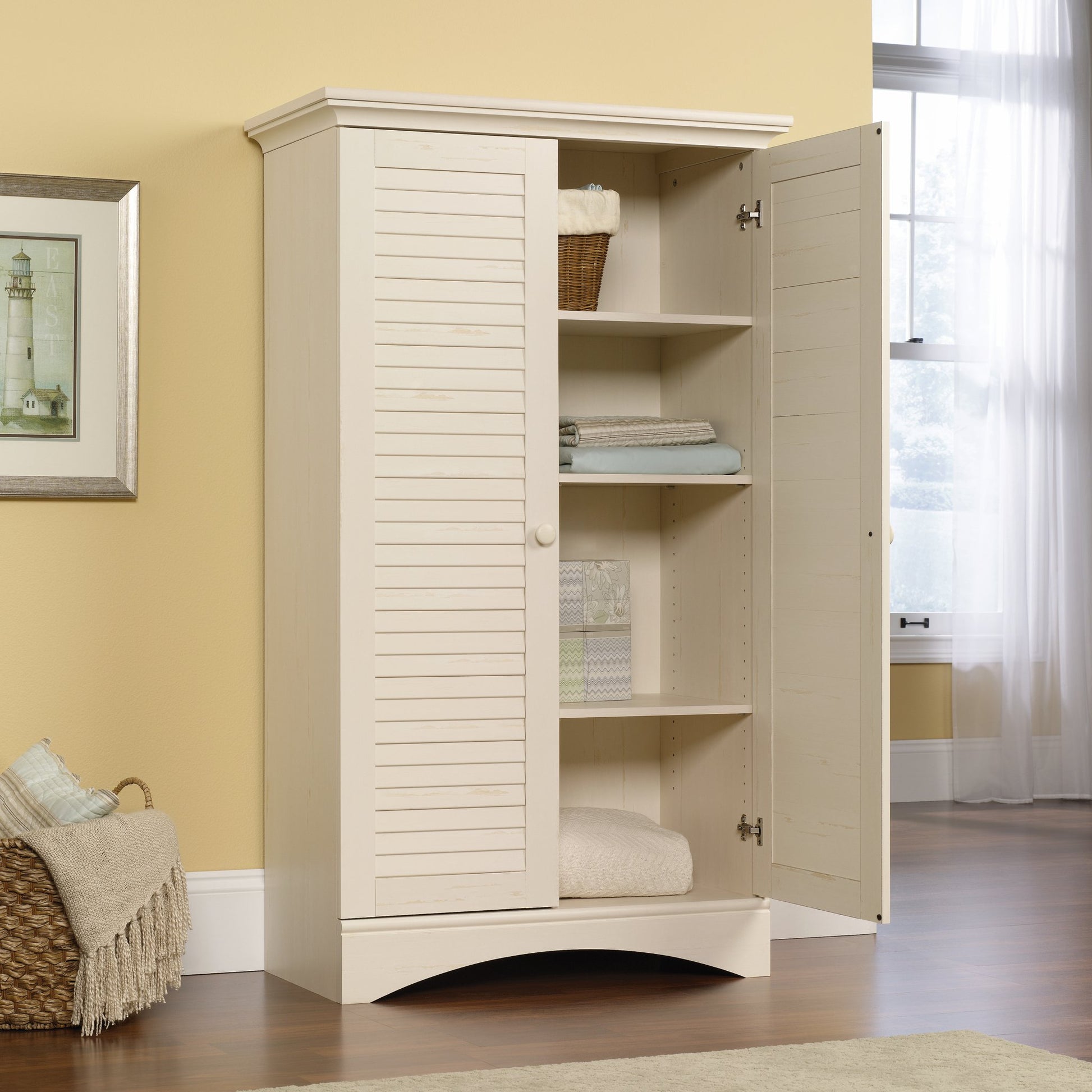 - Four adjustable shelves and full upper shelf allow for a wide range of storage possibilities for items such as blankets, pillows, laundry, kitchen items and more