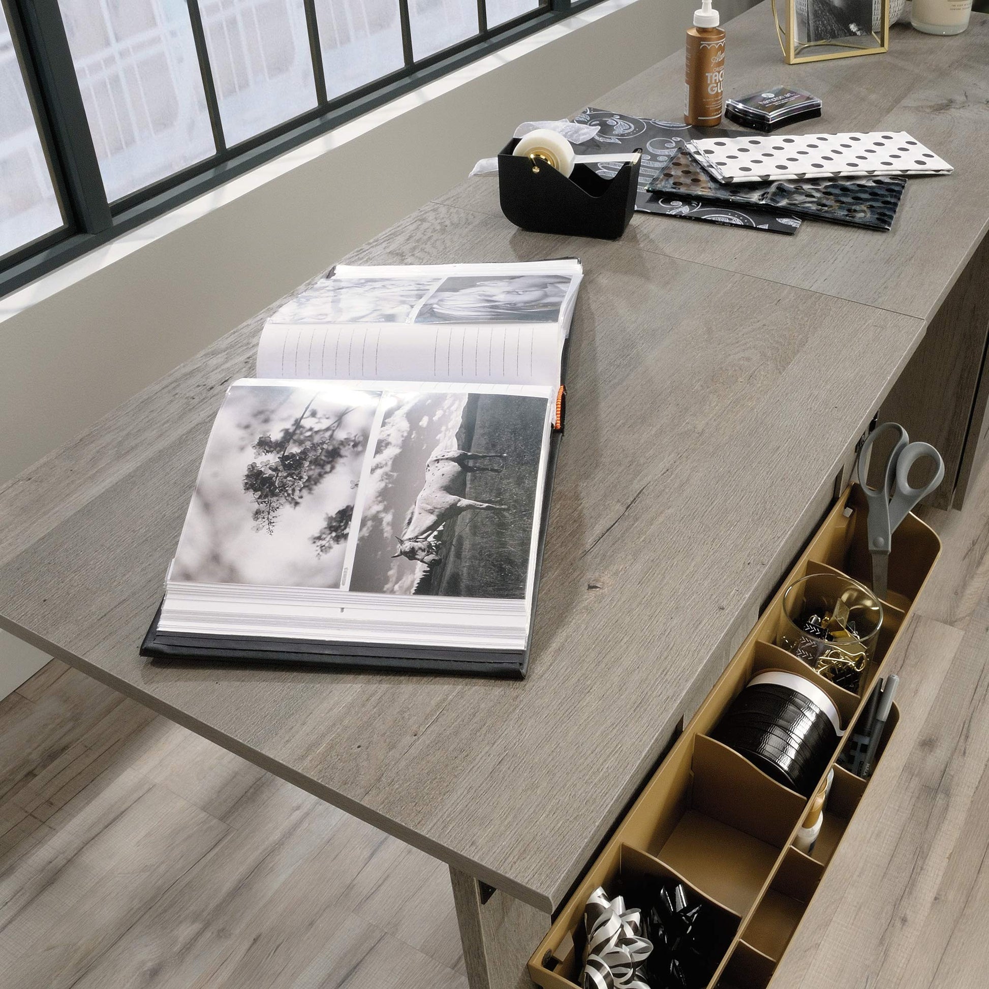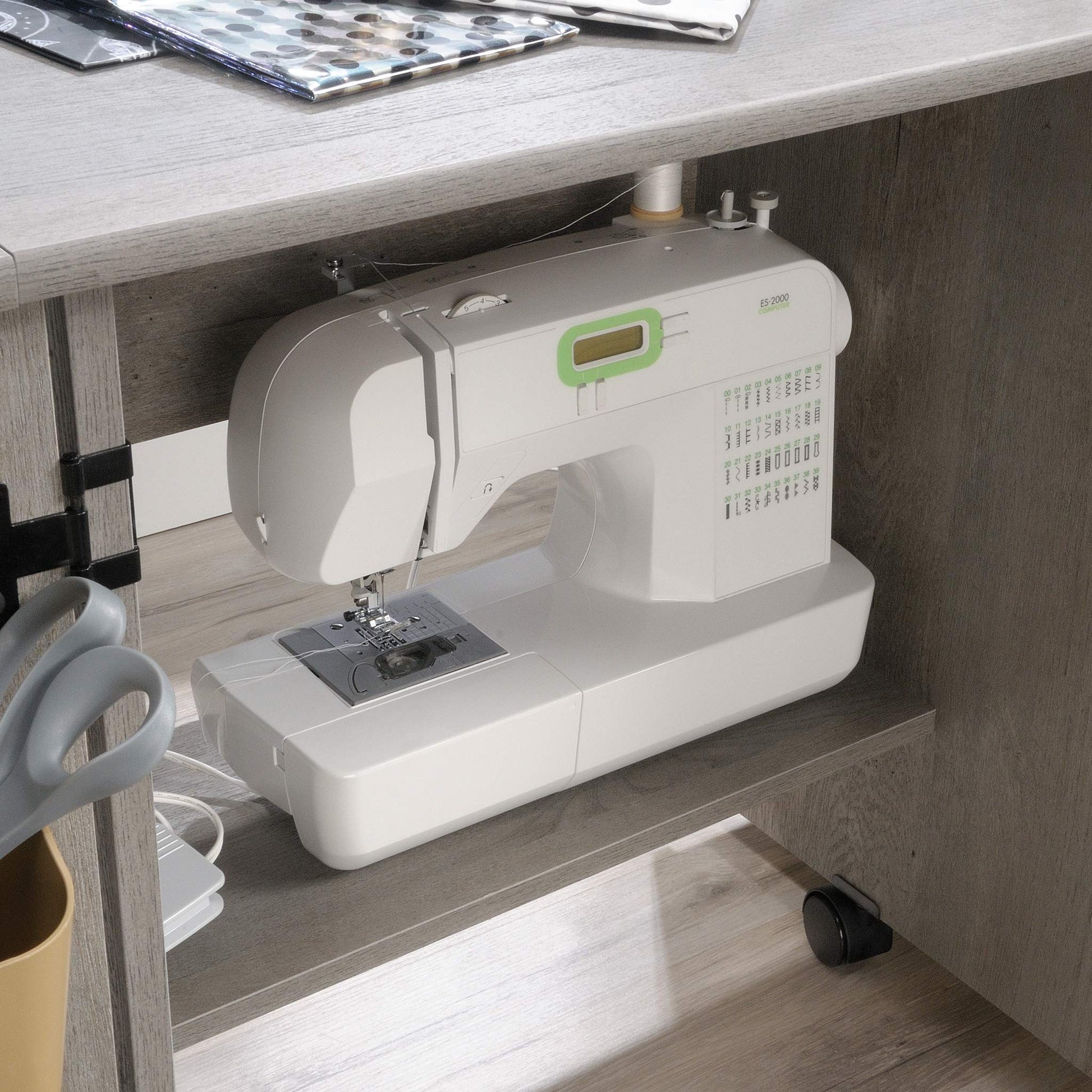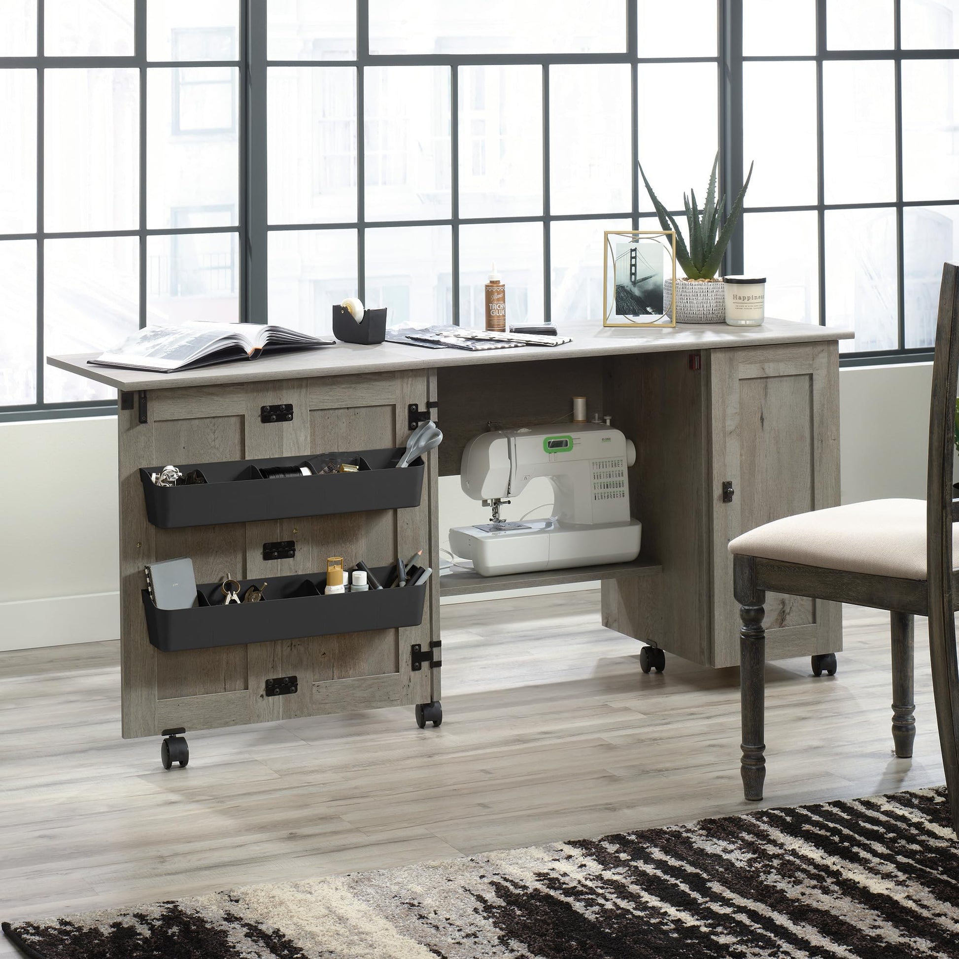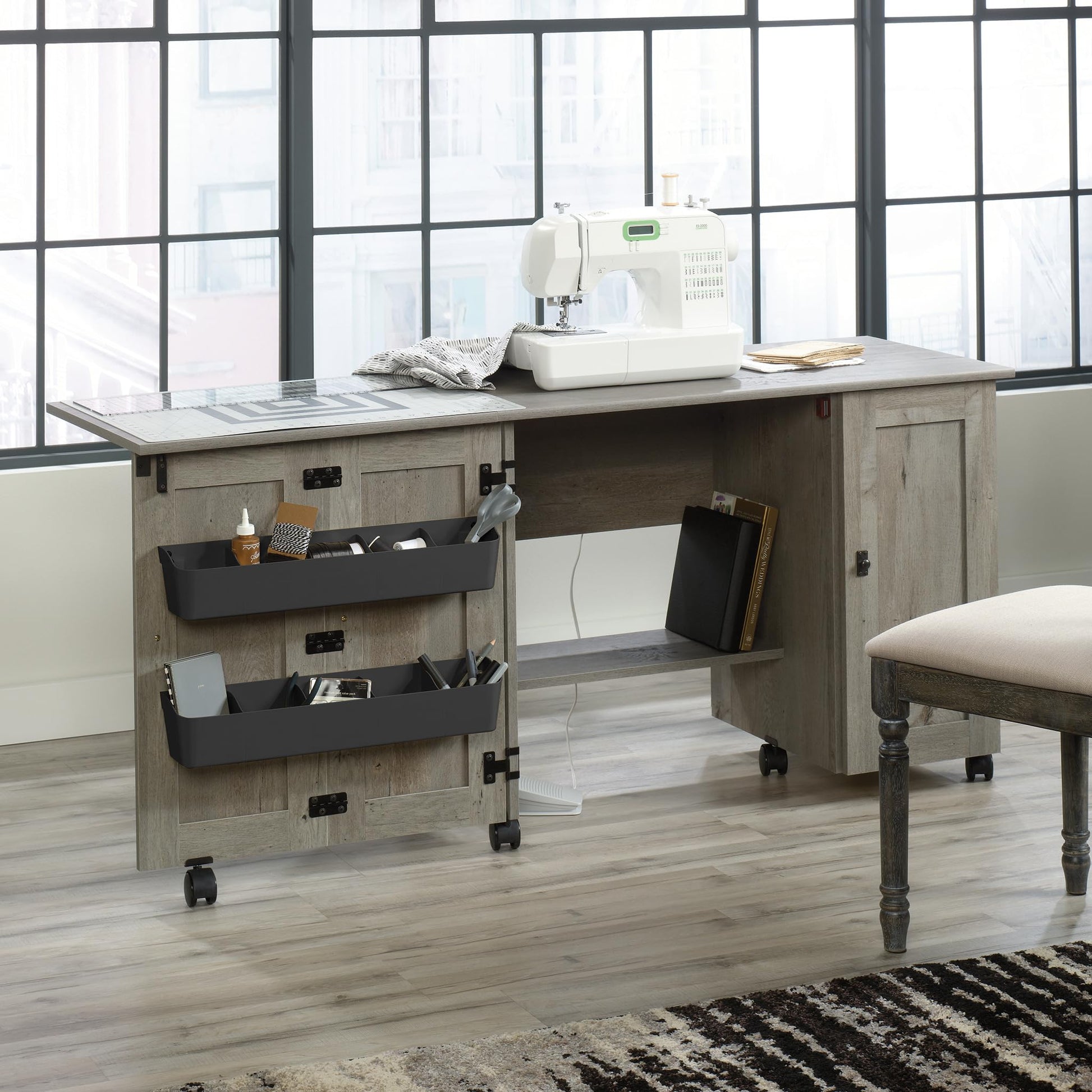 - Storage behind roll-open door includes two storage bins and hidden shelf for sewing machine