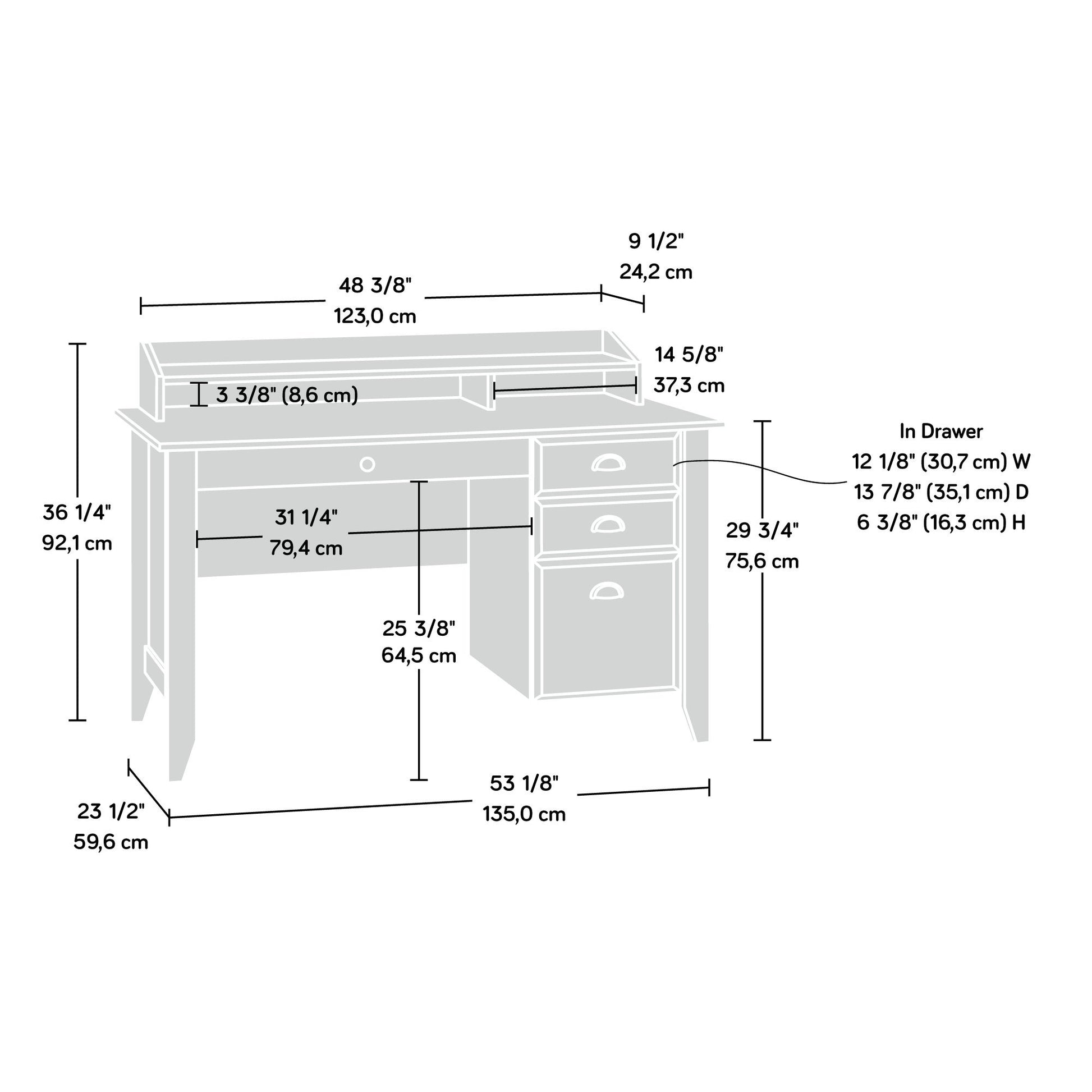 - Two outside drawers with metal runners and safety stops; lower drawer holds letter-size hanging files