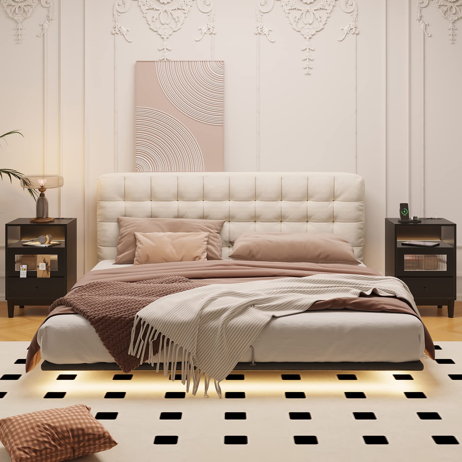 Black Nightstand with Charging Station, End Table with Glass Drawers, Night Stand with LED Lights,