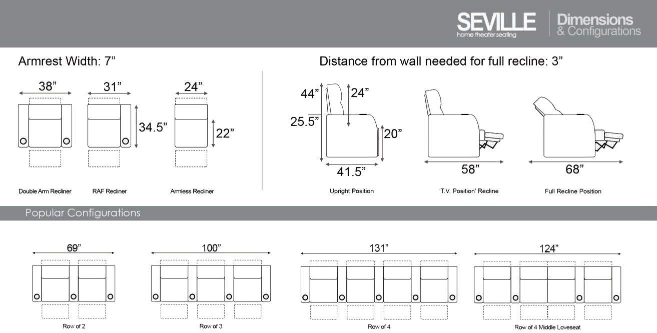 - Dimensions: Row Width 131", Height 44", Depth (upright) 41.5", Depth (fully reclined) 68"