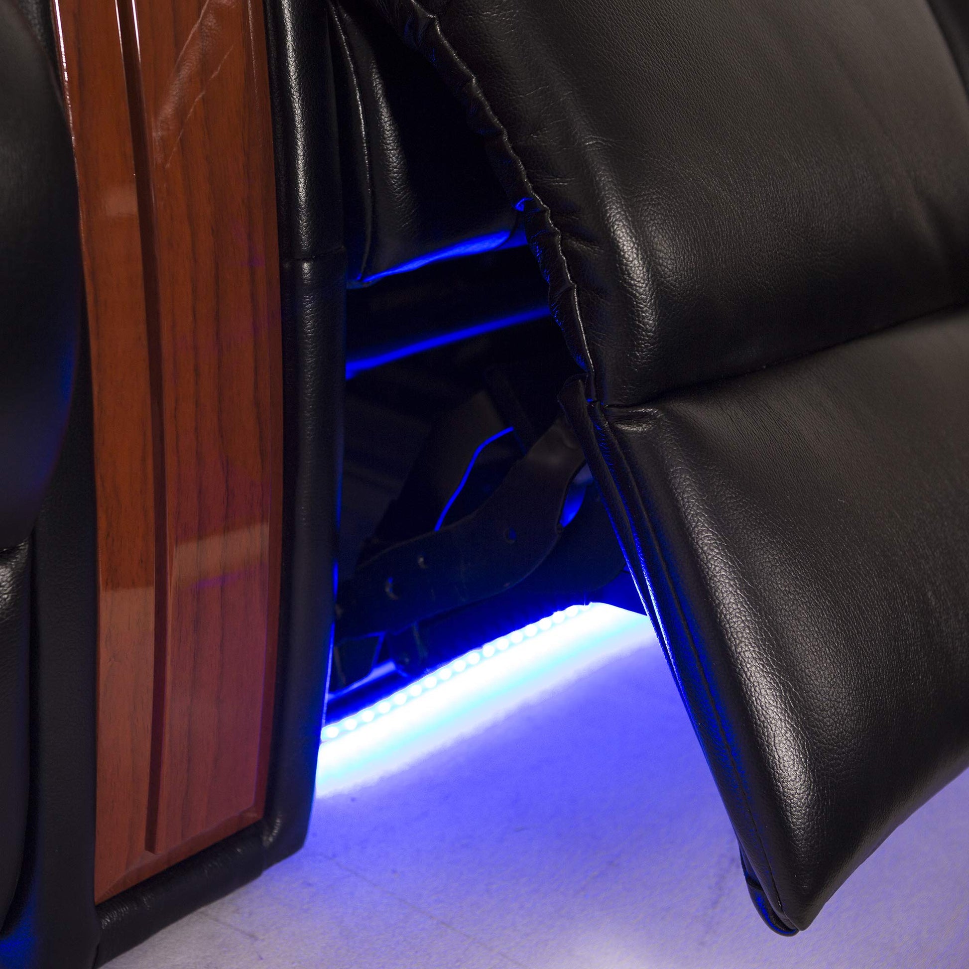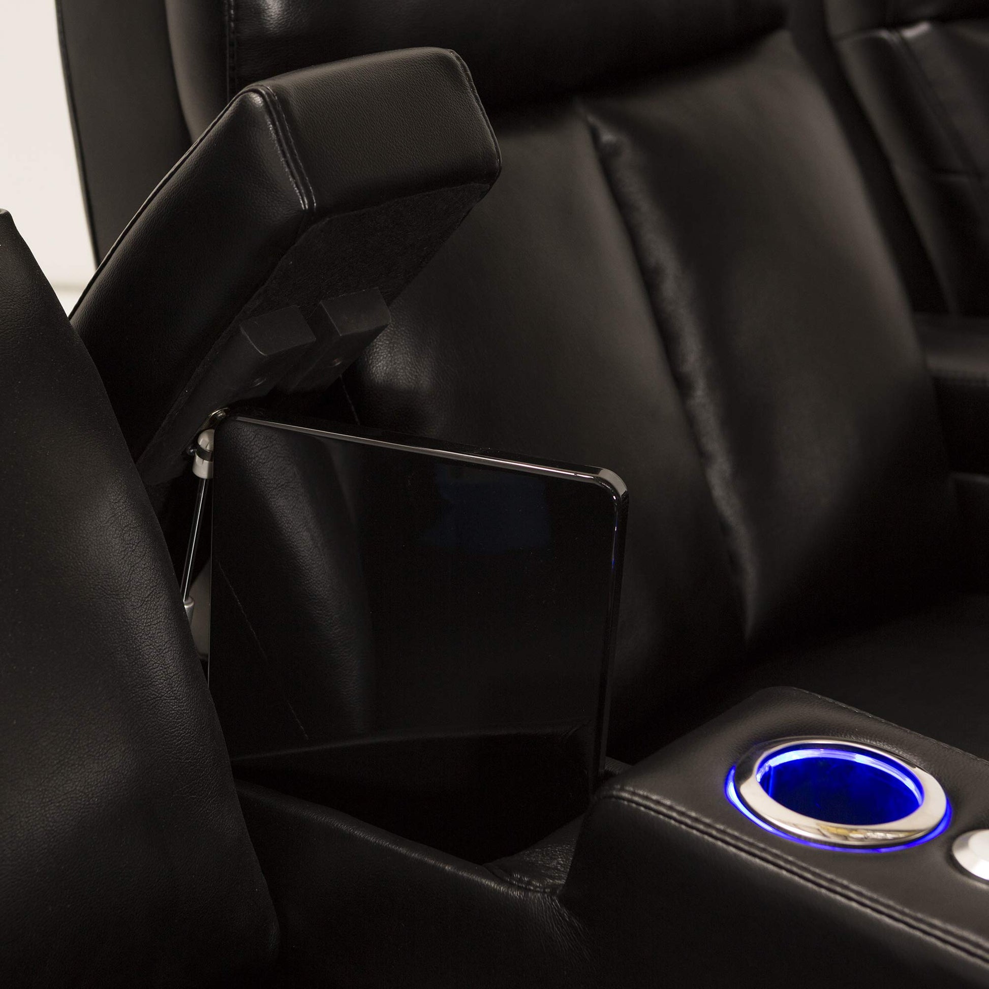 - HOME THEATER SEATING: USB charging ports, hidden in-arm storage, free tray table for each seat, lighted cupholders, and ambient base lighting