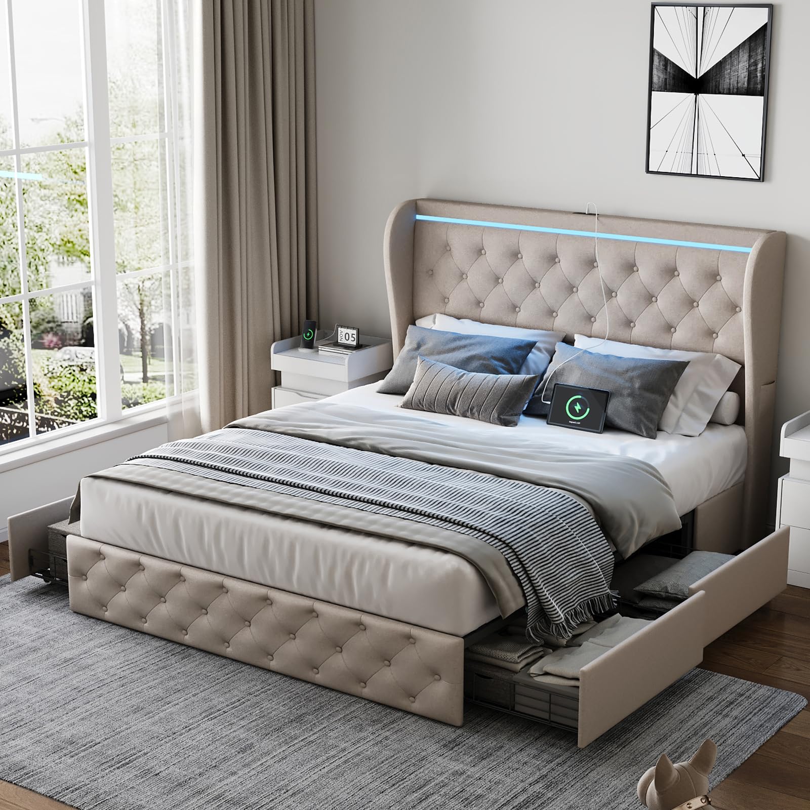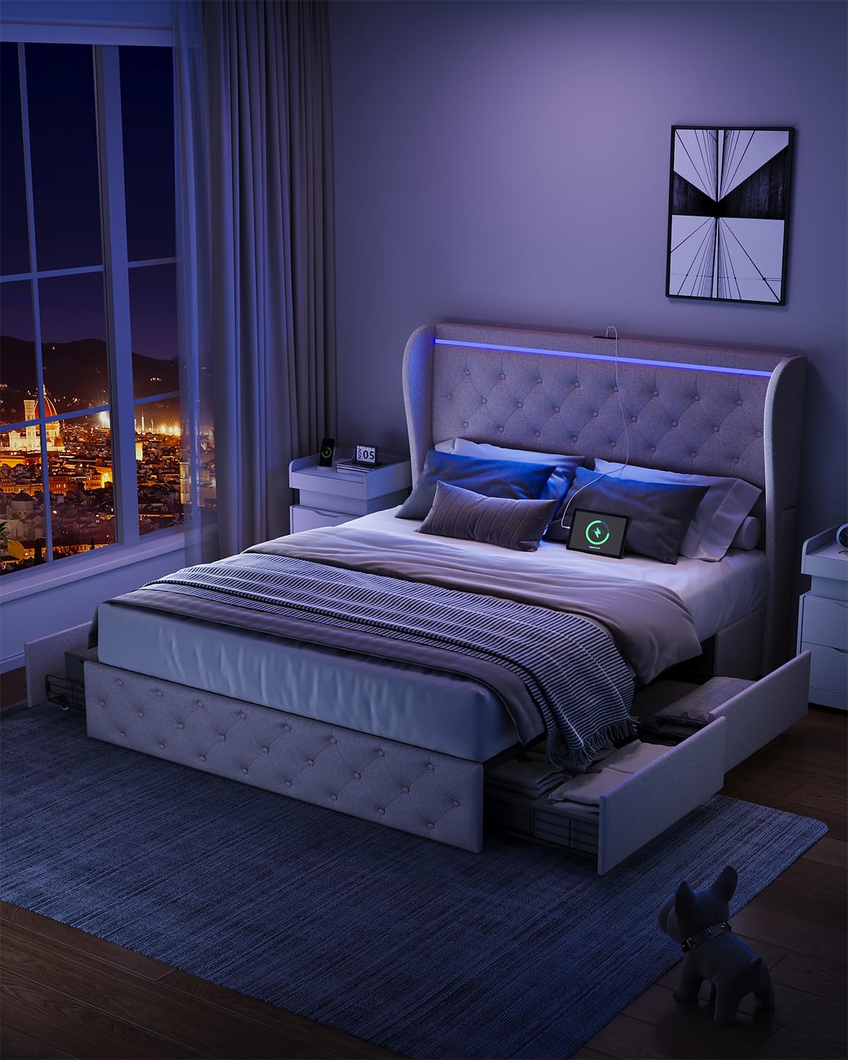 Bed Frame, Storage Headboard with Charging Station and LED Lights