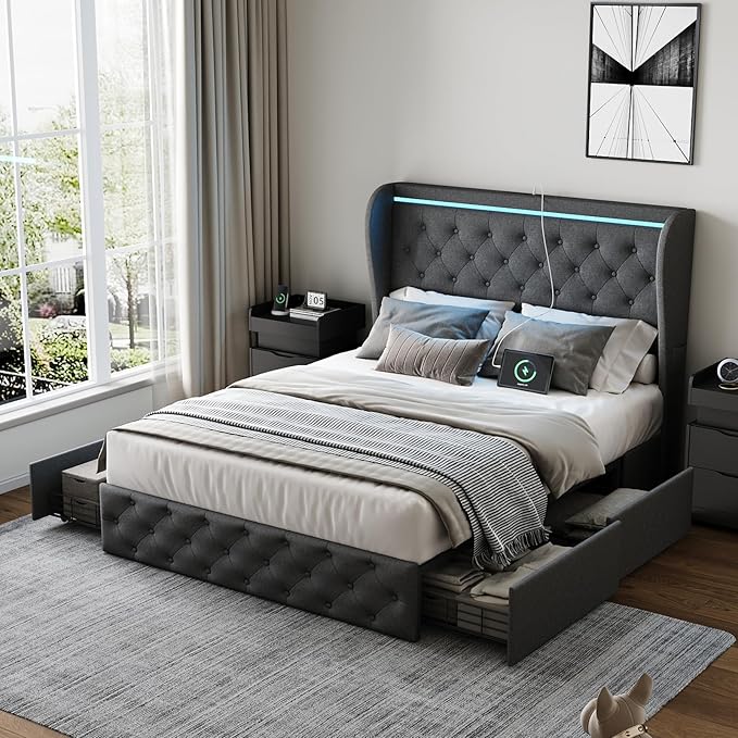 - Storage Headboard with Charging Station: The headboard is equipped with a built-in charging station, including 3 USB port and a type-C port, allowing you to charge various electronic devices within easy reach