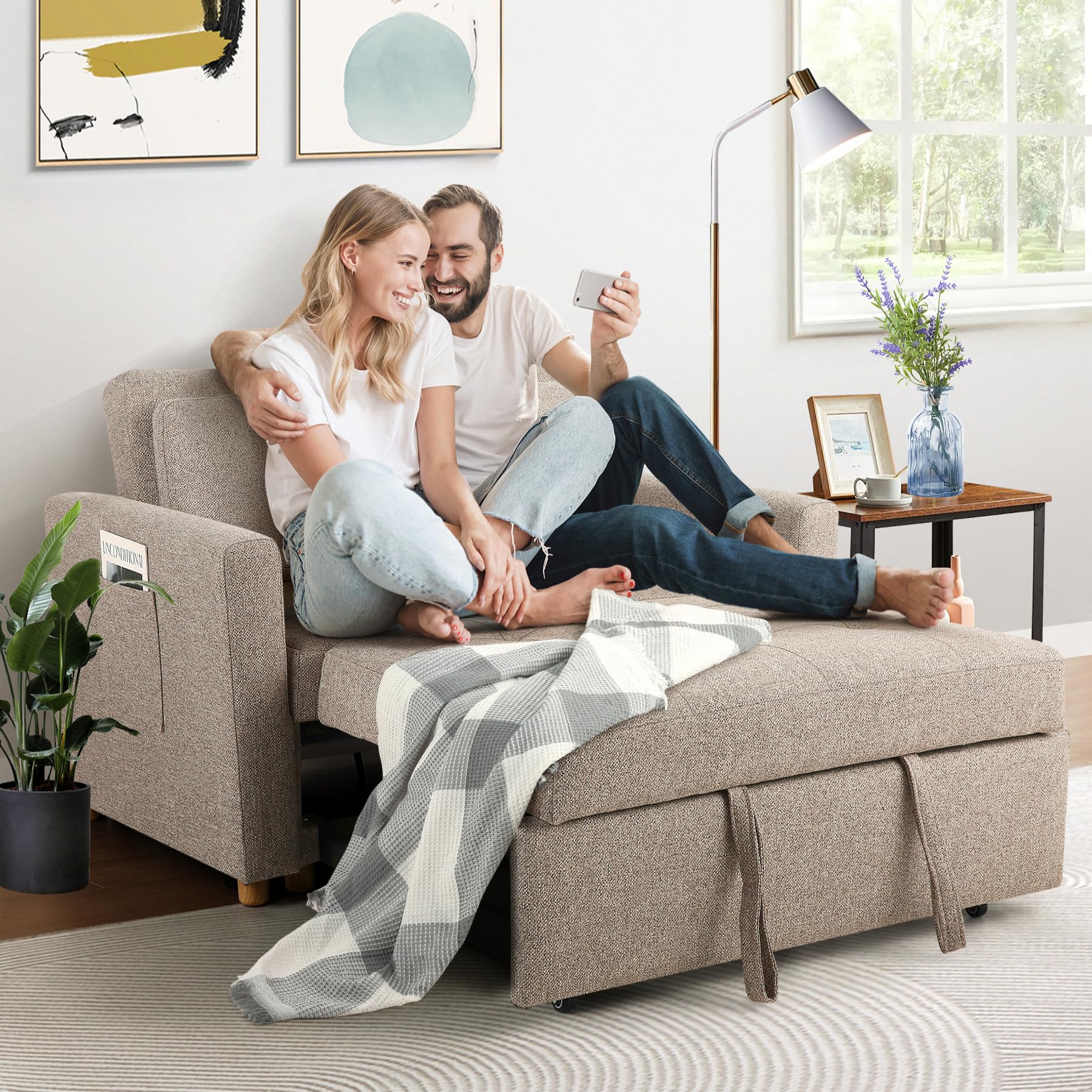 3-in-1 Convertible Sofa Bed, Linen Fabric Sleeper Couch Pull Out Bed, 49" 2-Seater Loveseat Futon Sofa with Spring Support, Adjustable Backrest and Pillows for Small Spaces, Living Room