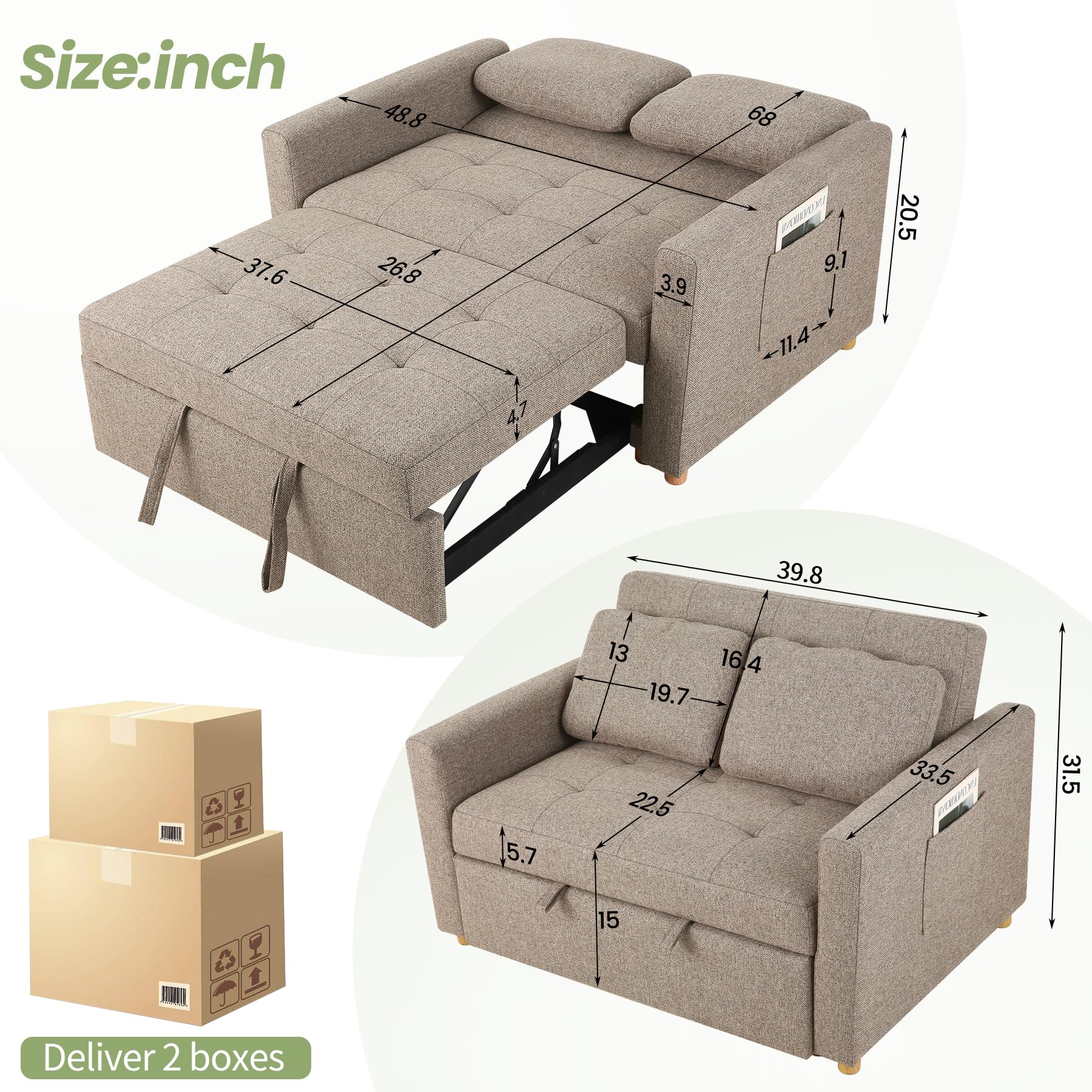 - Comes with 2 soft pillows that provide excellent support for your neck and head. Furthermore, the loveseat chair features 2 handy side storage bags, perfect for keeping essentials like TV remotes, cell phones, glasses, or books within arm’s : Delivered in 2 packages. The couch bed can assemble without other tools in 10 minutes. Sofa Chair: 48.8"W x 33.5"D x 31.5"H. Chaise Lounge: 48.8"W x 49.3"D x 31.5"H. Bed: 48.8"W x 68"D x 20.5"H. Any questions please contact the service team will respond in 24H.