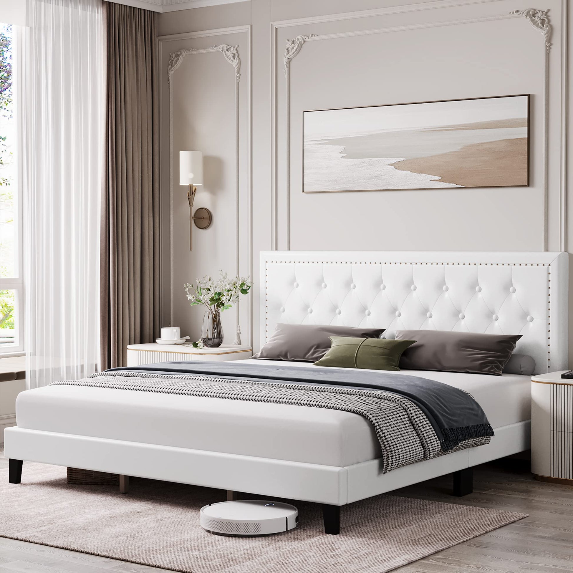 - Noiseless & Stable Support: With an adjustable headboard, luxury faux leather upholstery, sturdy slats and legs, and noise-reducing features, our upholstered bed offers a comfortable and stable sleeping experience for individuals of different heights, without the need for a box spring.