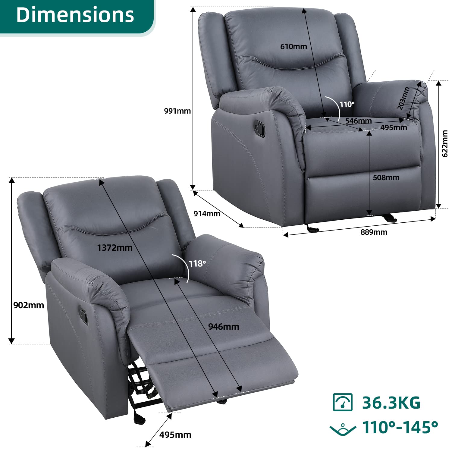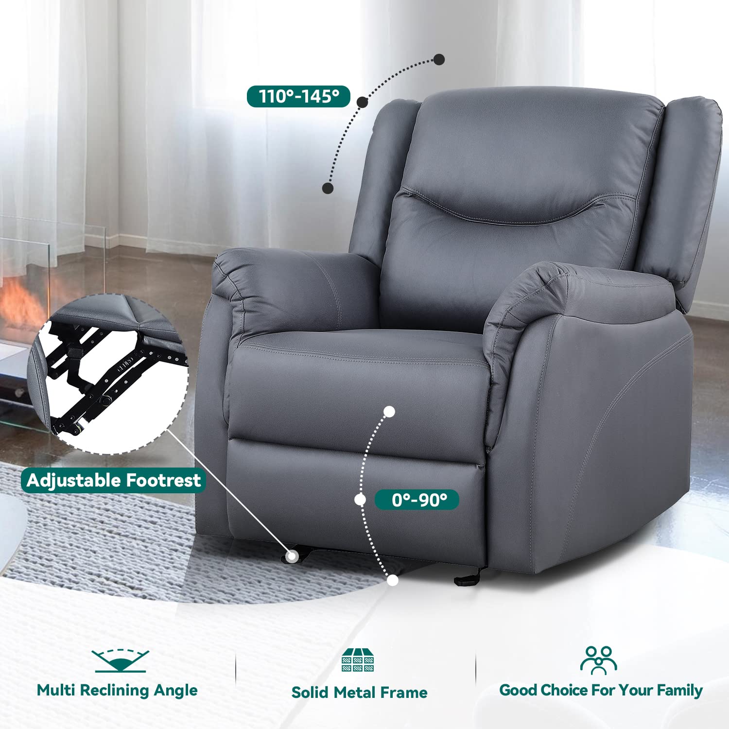 - Push-Button Recline: Reclines from 100° to 145° with an ergonomic backrest that supports your entire body.