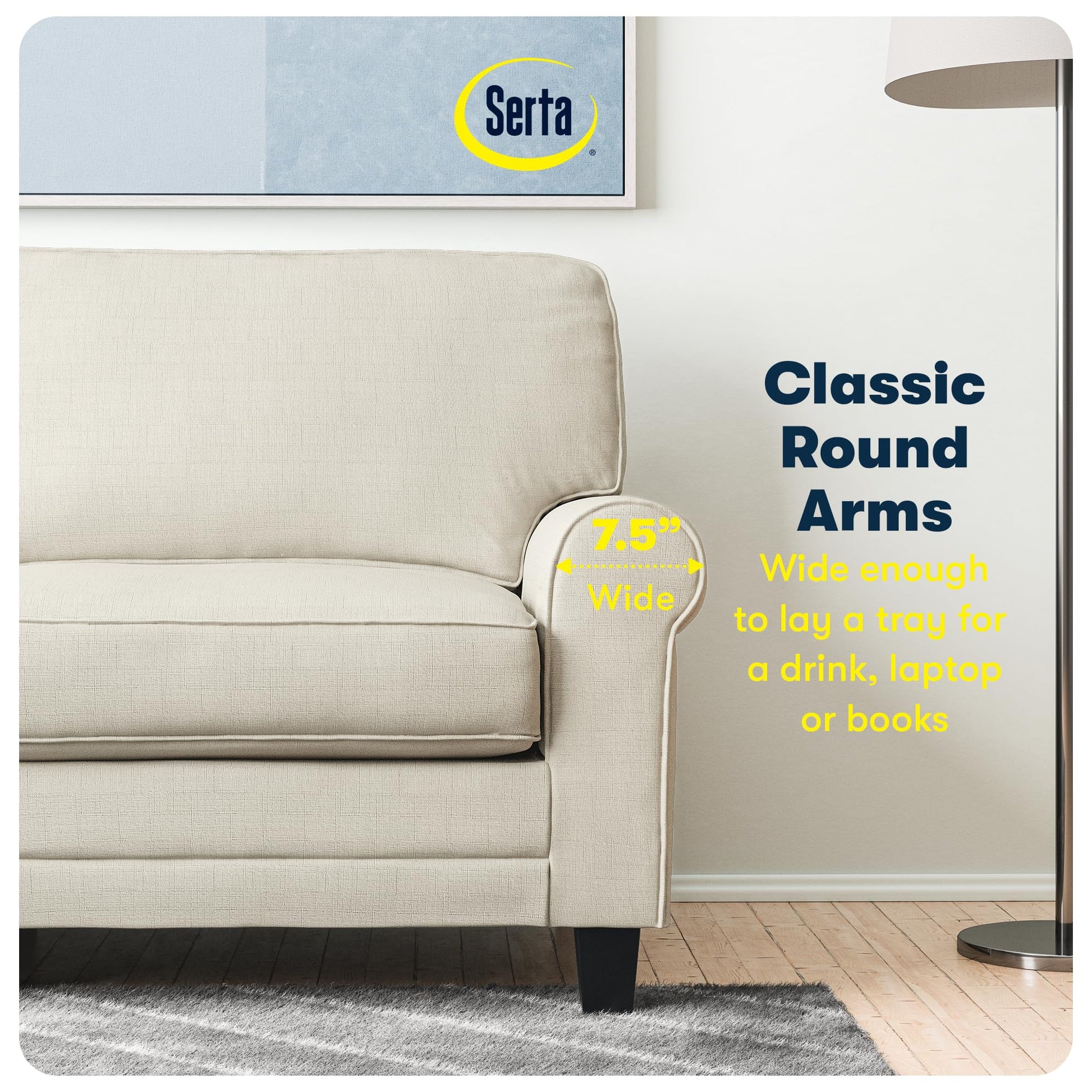 - SERTA FOAM & BUILD: Made of a solid wood frame fitted with sinuous springs for extra support and sturdy solid wood legs that can handle up to 500 lbs. All Serta sofas use quality, non-recycled and non-toxic foam for breathability and safety.