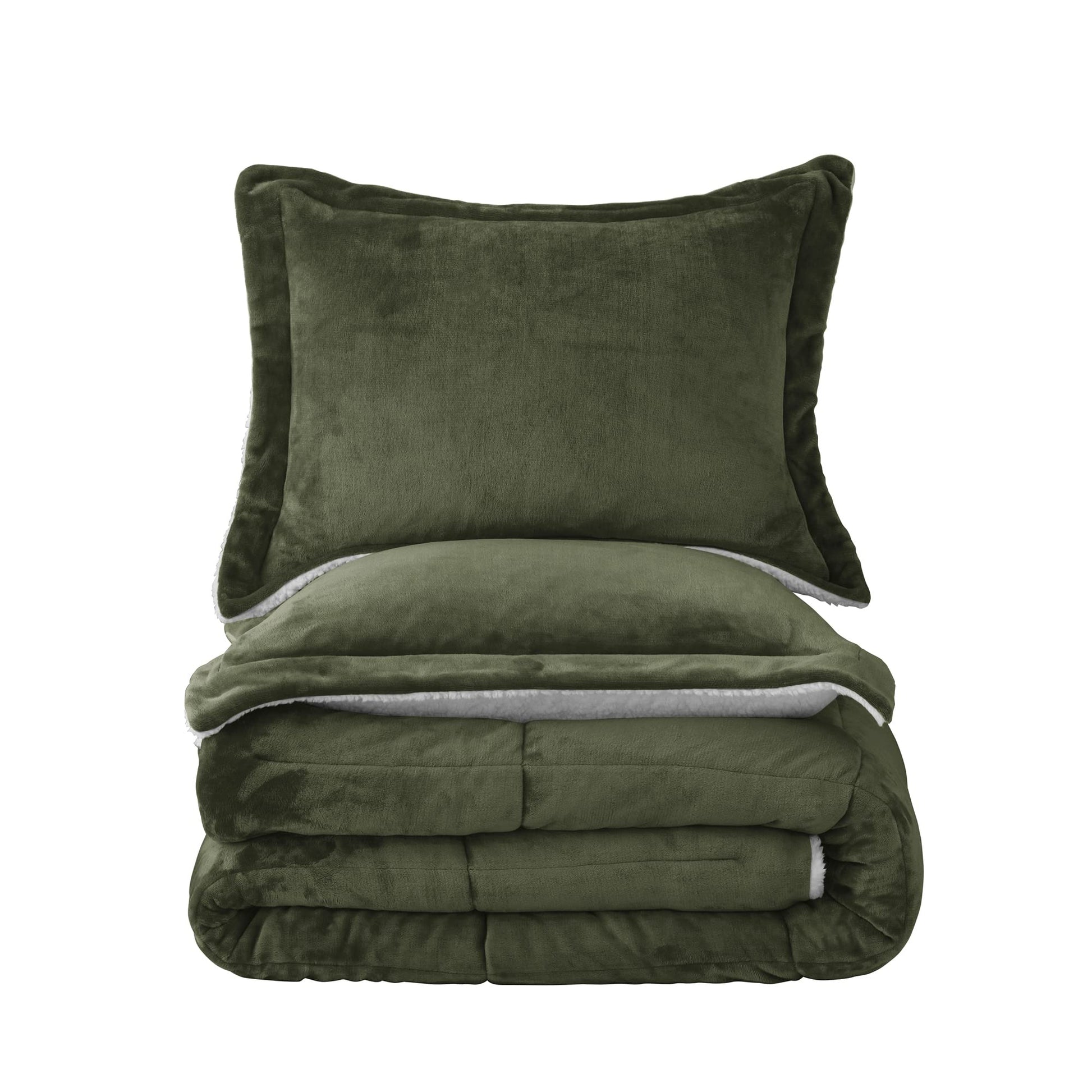Olive Green Sherpa Comforter Set Full Queen Size, Soft All Season Down Alternative