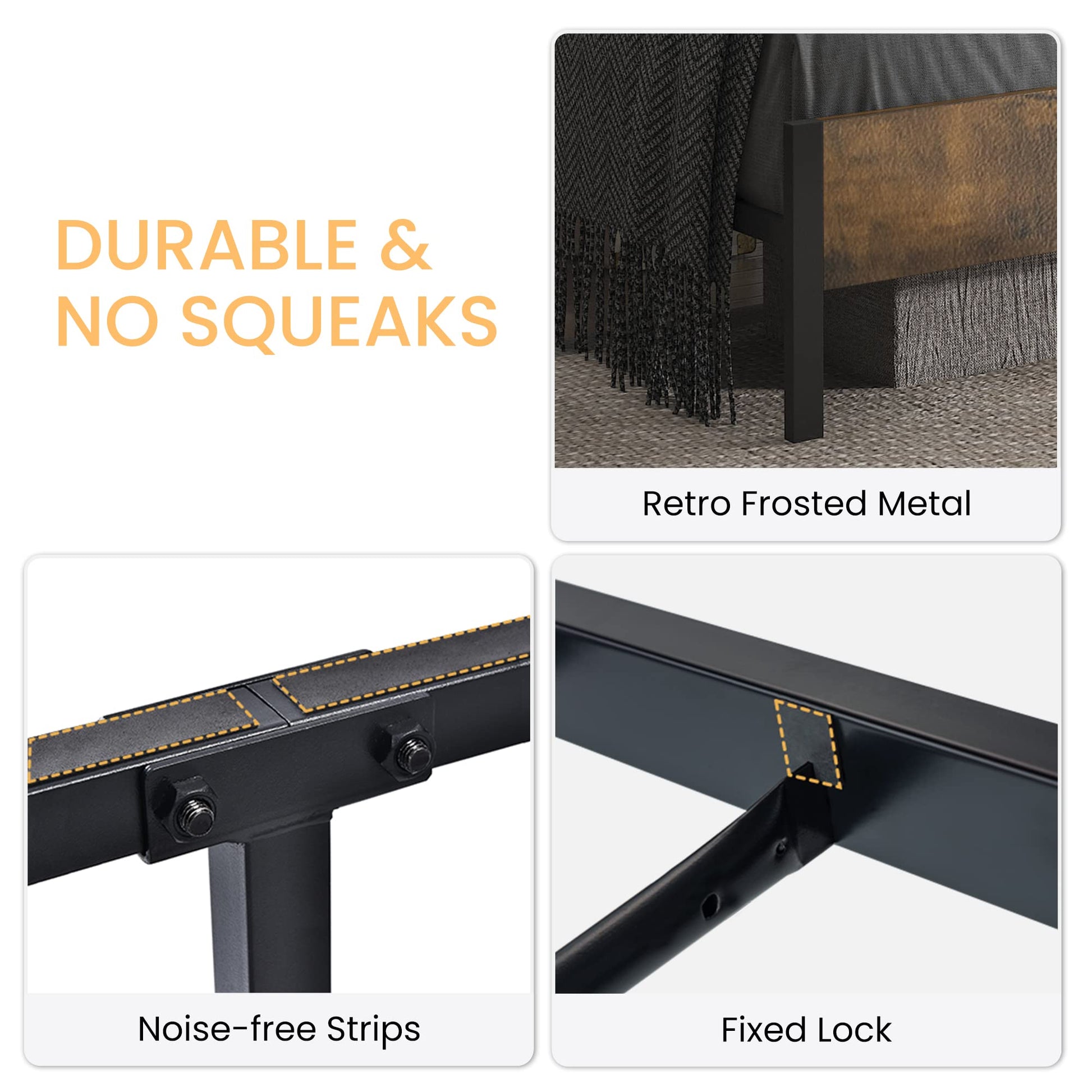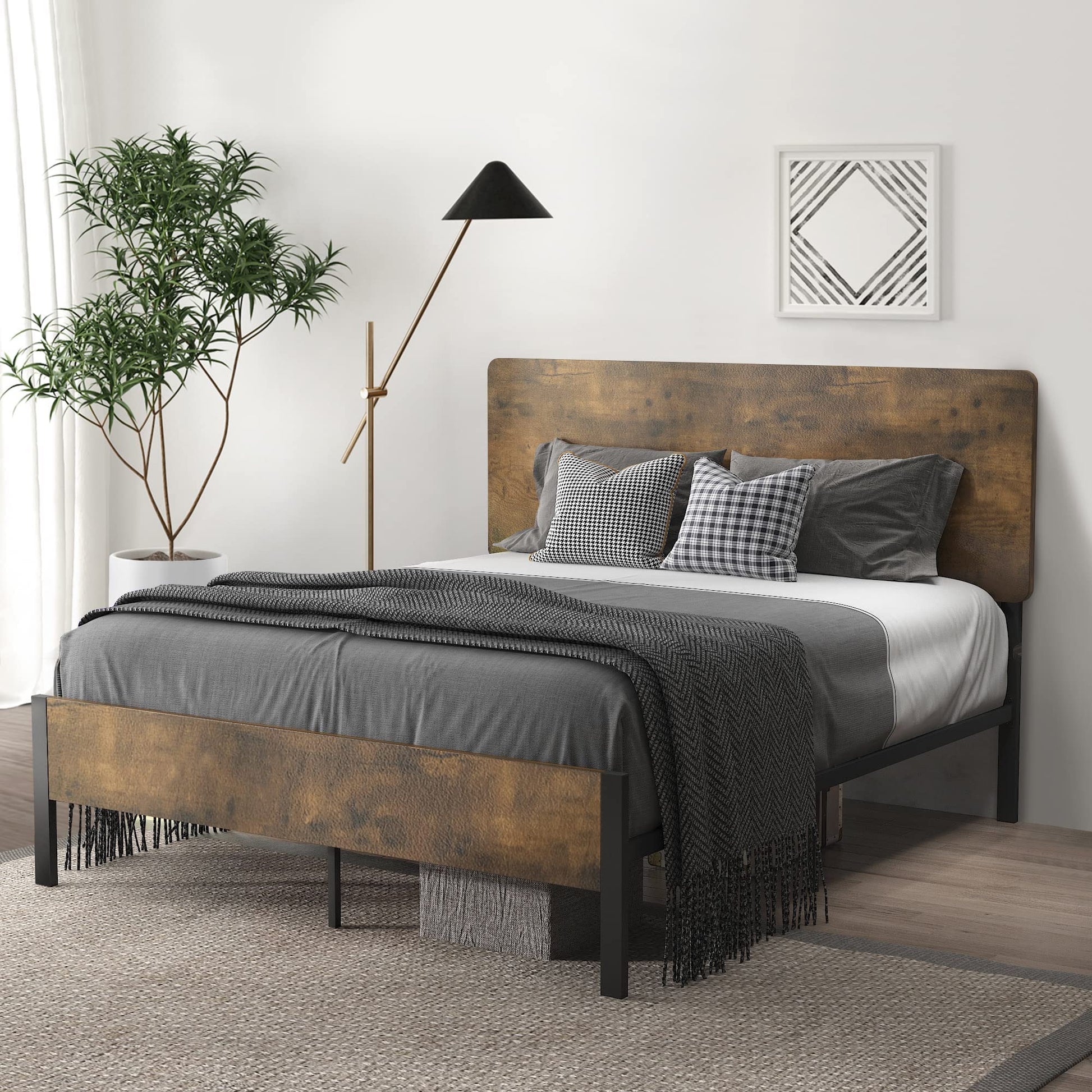 - The combination of an industrial-styled headboard, footboard, and retro frosted metal slats takes a strong industrial/rustic flair, rich your room in Industrial and unique individualism. The wood headboard consists of a Waterproof & Scratch proof board Method of welding platform structure and using fixed screw is adopted in the design. Capacity up to 600lbs.